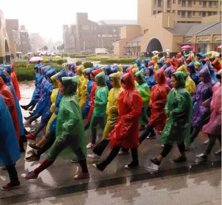 从军训前三天,天空就一直下雨,雨稍小一些时,新生们就客服困难披着雨衣进行军训,即使地面上有积水,同学们仍然勇敢的踏过去。挥洒的雨水,整齐的步伐,嘹亮的口号成为校园里一道靓丽的风景线。雨特别大的时候新生们在教室里接受训练。即使空间有限,却却一遍又一遍训练着站姿、坐姿、蹲姿等一系列动作。雨中的军训更好的锻炼了同学们的体魄、磨练了同学们的意志,给同学们留下了深刻的印象。