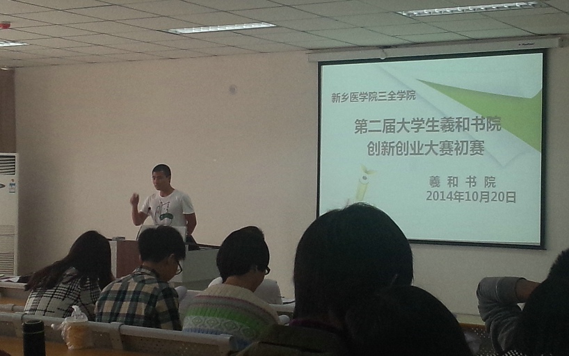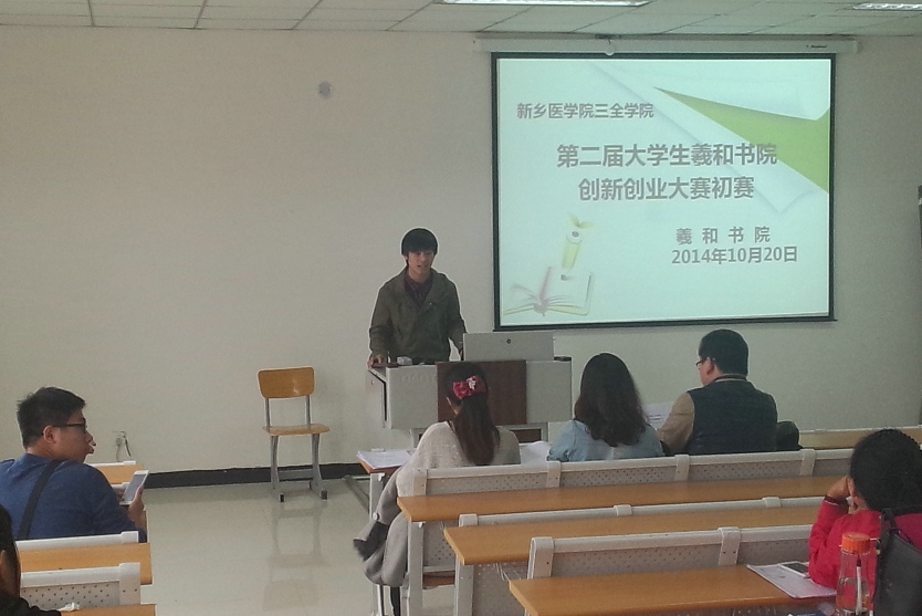 10月21日中午,第二届创新创业大赛在新乡医学院三全学院平原校区第一教学楼C201教室举行。我院评委老师王莉、刘凯、张俊景老师出席了本次活动。几十余名同学聆听了此次比赛。