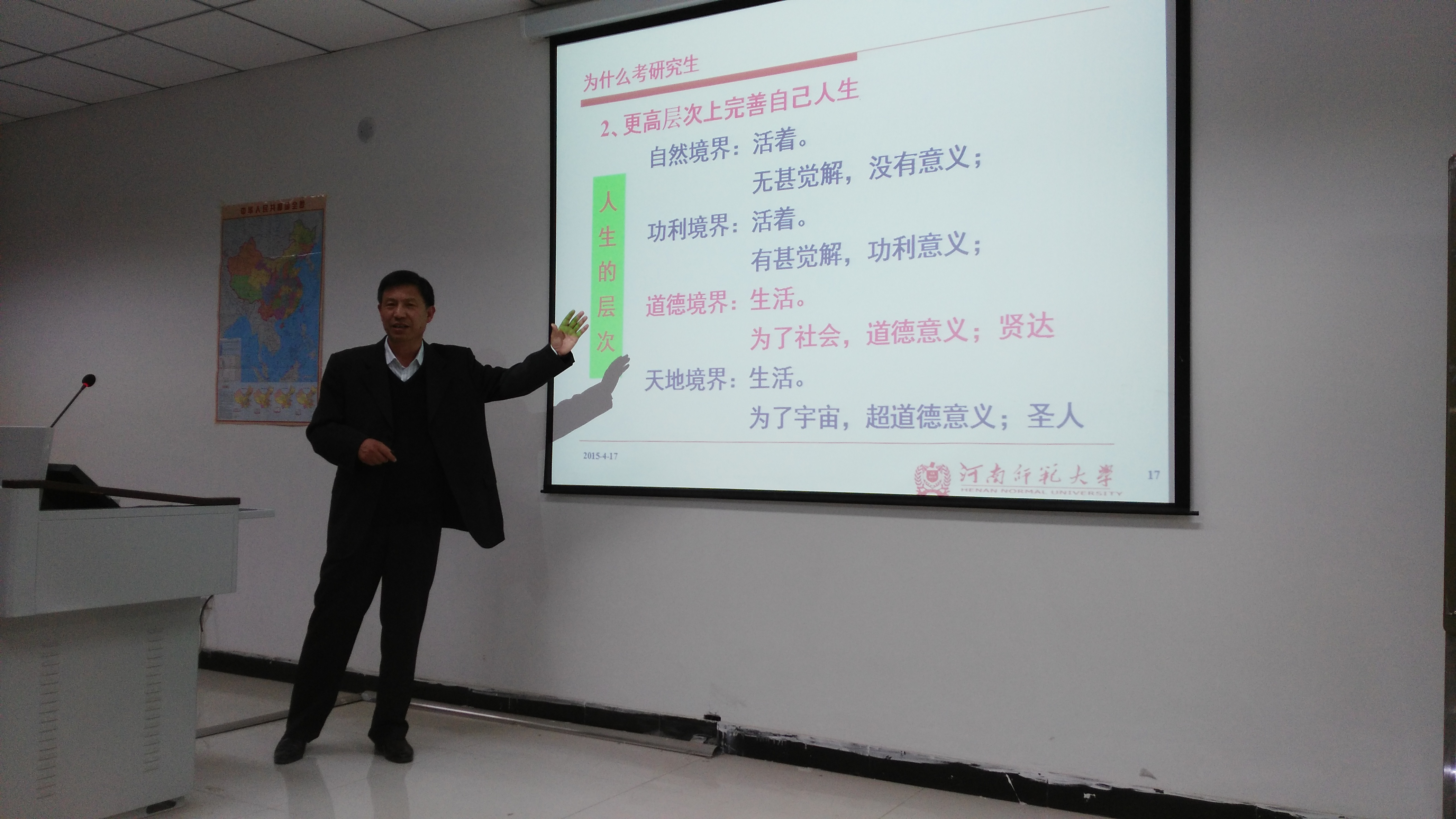 卢龙斗教授以《钢铁是怎样炼成的》一书中保尔柯察金对人生的感悟为开篇向大家阐释了何为“辉煌人生”。从服务国家、完善自己和孝敬父母三个方面讲述为什么考研,引起了同学们的共鸣和喝彩;从学生智力、学校传统、师资力量、课程体系和校园环境等几方面讲解了我们的考研优势,为学生们考研鼓劲。从如何备考,如何学好外语,如何调剂等方面讲解如何考上研究生。最后,卢教授与学生进行了热情的问答互动。