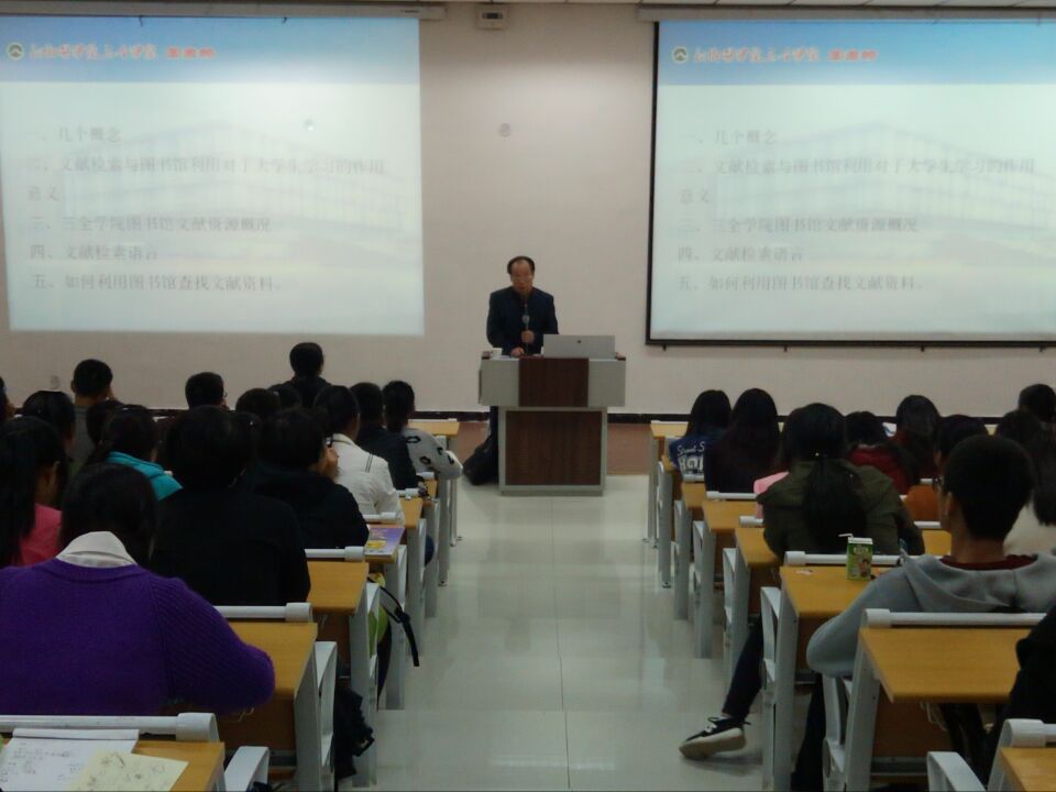 华教授以校园风光展现视频为开篇,围绕“文献检索与图书馆利用对于大学生学习的作用、三全学院图书馆文献资源概况、文献语言、如何利用图书馆查找文献资料”等几个方面展开阐述:华教授强调“图书馆是人类知识的宝库”,并以德国柏林大学图书馆门口的格言--“这里是人类知识的宝库,如果你掌握它的钥匙的话,那么这里的知识全是你的”为例,阐述了图书馆对于大学生的重要意义;针对我院的文献建设状况,华教授介绍,目前我校特色馆藏体系重点放在了电子文献和扩展我院文献信息资源的来源渠道上。接着,通过对传统和计算机两种文献检索方法的介绍,特别对我校馆藏图书检索进行了详细的讲解,使学生可以有效、便捷、高效的利用图书馆电子文献数据库。