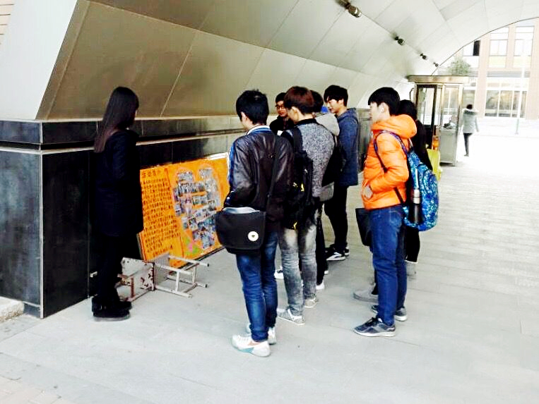 清晨,活动展板就已经安置到位。展板内容精彩纷呈,其中包括活动简介、活动宗旨、活动照片。同学们表现出了极大的兴趣。他们仔细阅读,并询问其活动制度,解说员耐心作答。同学们看到照片上参赛队员们在大赛期间辛苦又充实的生活,不免发出感慨,希望自己可以像他们一样,学会吃苦。