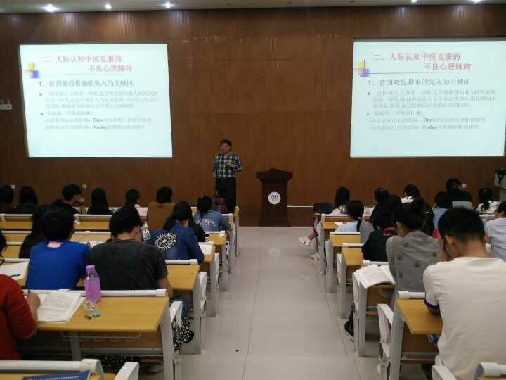 赵俊峰教授首先从人际认知的概念切入主题,向同学们阐述了人际认知的范畴、最新进展及特点,并给同学们讲述了人际认知的具体内容以及人际认知在工作、生活、学习及研究中的重要性,赵教授幽默诙谐的讲授,赢得同学们的阵阵掌声。他还通过真实事例及图片,讲解了人际认知中应当克服的不良心理倾向,如首因效应、近因效应晕轮效应、刻板效应、投射效应、定势效应等。最后,赵教授联系实际分析了积极性偏差、证实偏差、后视偏差、自我中心偏差、归因偏差等概念。