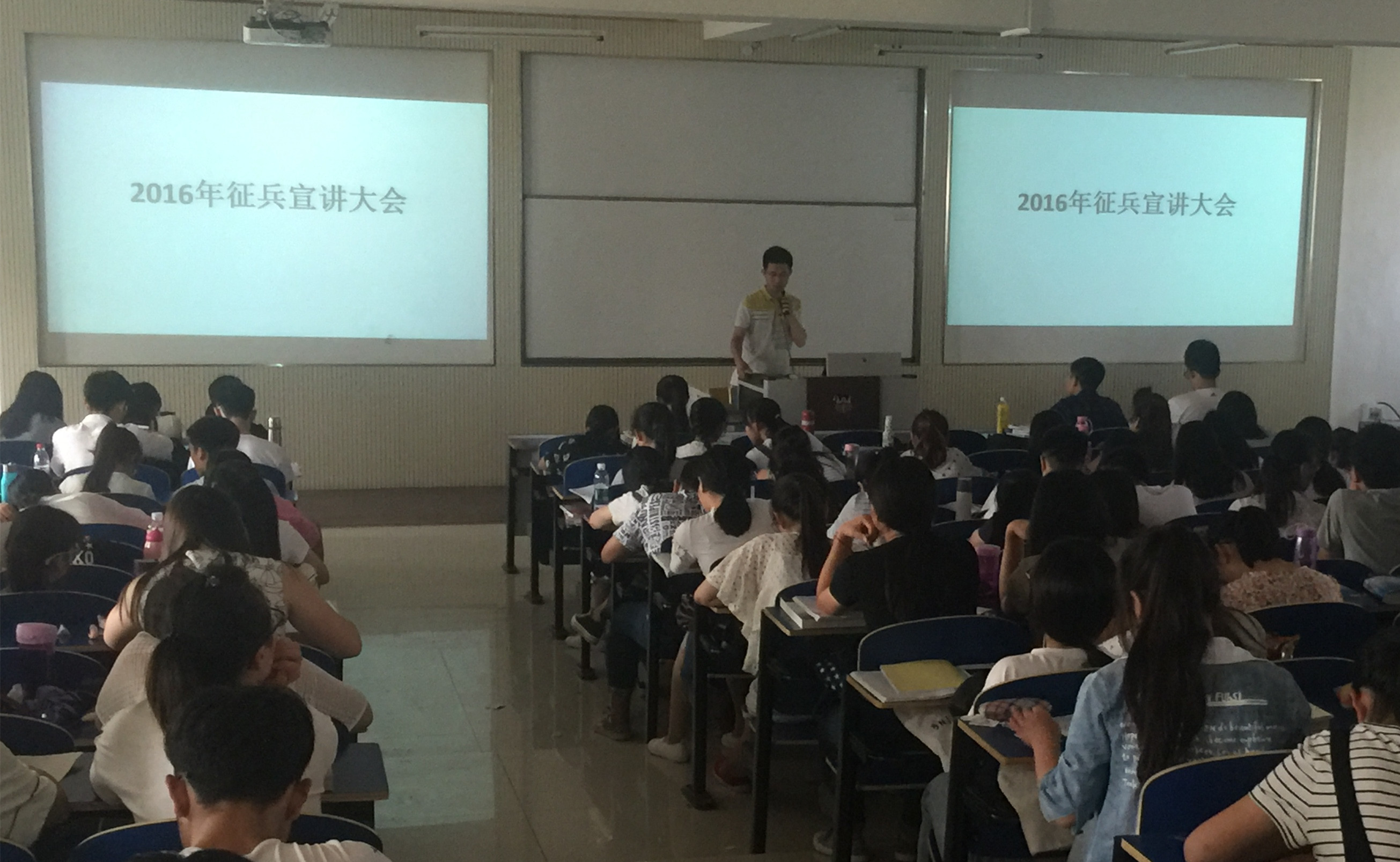 会议上,刘林老师首先就所有人最为关心的征兵的就学、就业、经济补助等方面政策进行了详细的解释说明,随后又向学生们介绍了2016年征兵工作的预征对象、身体条件等情况。接着又对之前学生提出的有关学费减免、落户要求、复学助学等相关问题作出了回答,会场气氛十分热烈。最后,他再次强调入伍对自身对国家的价值,鼓励大家为实现人生价值选择正确的方向。