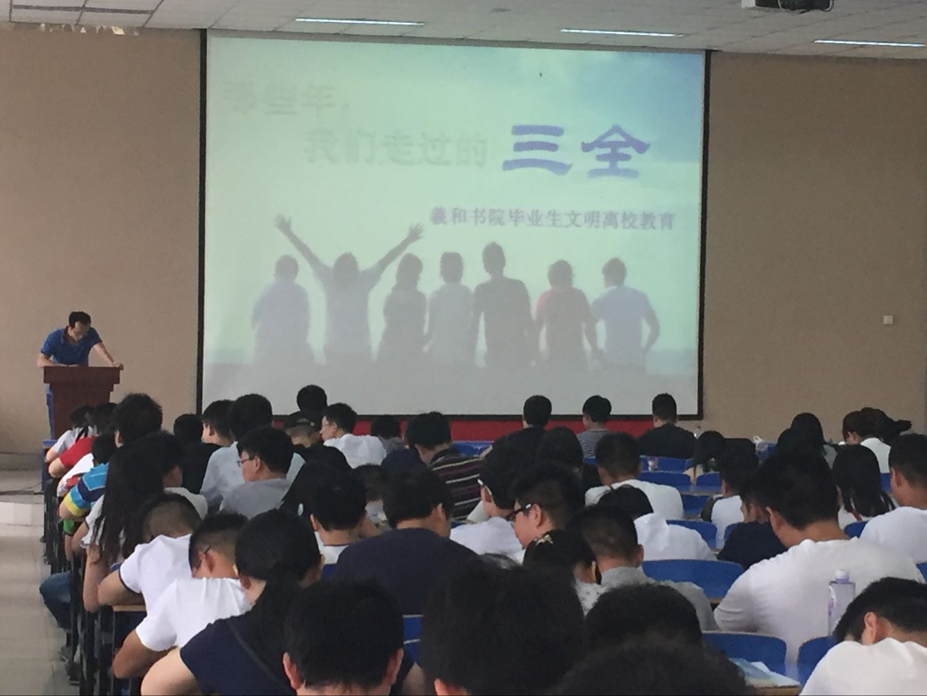 为引领毕业生坚定理想信念,明确奋斗目标,增强克服困难、建功立业的信心,顺利实现由“学生”向“社会人”的角色转变,羲和书院面向全体毕业生深入开展了“文明离校”、“诚信感恩”、“心理健康”、“廉政入职”等多项主题教育活动。以“遵守纪律,文明离校”为要求,开展离校行为教育;以“及时偿还贷款”和“严肃签约态度”为重点,强化诚信教育;组织开展廉政入职教育,观看反腐倡廉电教片。