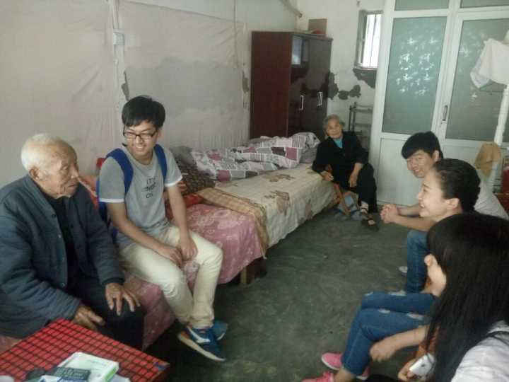 夕阳红老人公寓有两层楼房和一个较大的院子,共住40多名老人,一层住着一些身体健康可以行动的老人,老人们经常在院子中活动身体,而二层住的是一些身体不便的老人。在夕阳红老人公寓中,队员们慰问了数位老人。其中最令人瞩目莫过于一位90多岁的老人,老人曾经作为医务兵数十年参与数个战役。纵然老人已经90多岁了但是身体依然十分硬朗,精神饱满。在队员们与老人聊天中,队员们得知老人作息规律时常锻炼身体,也听老人讲当兵的经历,老人也为队员们科普了关于人体脉络的相关知识。还有一位来自山西的老人,她与其中一名队友为老乡,两人聊了许多关于家乡的事情,老人十分和蔼可亲,一直夸奖队员。在慰问的过程中发生了一件十分紧急的事情,一位神志不清的老人趁工作人员不注意爬上了楼顶,幸运的是男队员们反应迅速将老人从楼顶带了下来,得到了工作人员的感谢。慰问其他老人时,有的老人神志已经不太清楚了,不停地询问着队员的名字,而队员们不厌其烦的回答他。三天的慰问活动中,队员们慰问了数名老人,并帮助老人做了一些力所能及的事情,比如打扫卫生,帮助护工照顾行动不便的老人。在离开时队员们向辛苦工作的工作人员表达了感谢,并与老人及工作人员合影留念。