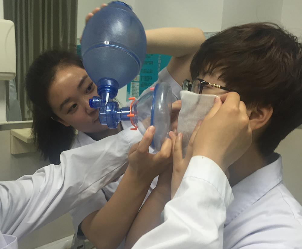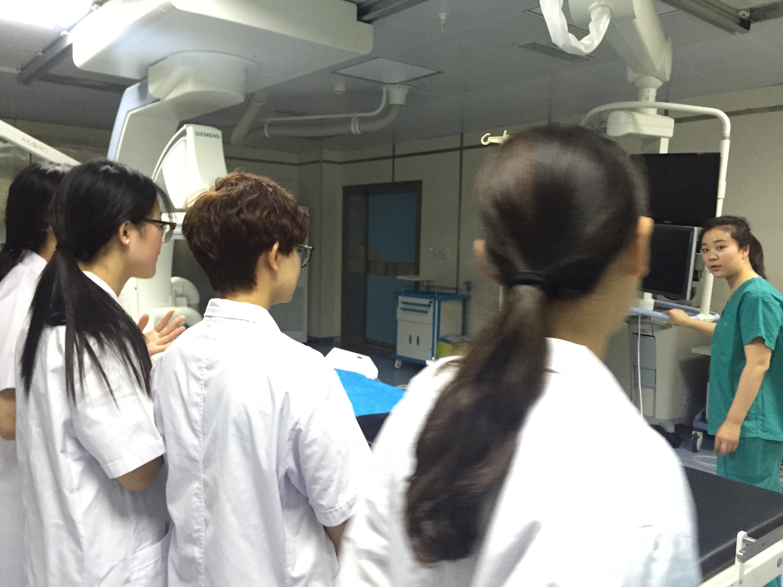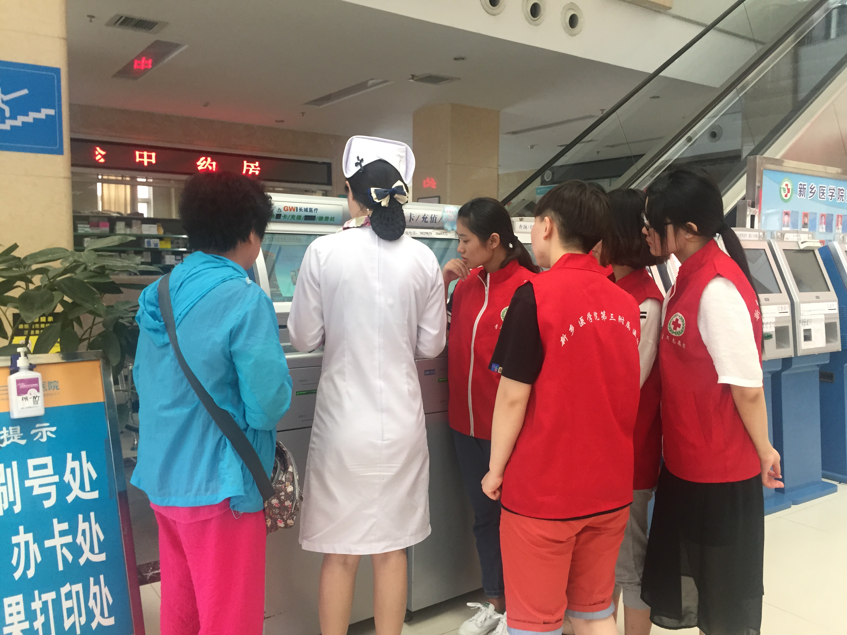 团队首先到了门诊部,在这里,队员们和综合服务台的工作人员沟通并取得他们同意后,穿上印有“新乡医学院第三附属医院”字样的志愿者服装,在门诊部帮助有需要的人。门诊部大厅设有自动充钱机,正在队员们研究如何使用它的时候,一位阿姨需要给生病的家人充钱,综合服务台的工作人员上前教她如何使用,这对队员们来说可是个学习的好机会,赶紧凑上去,认真听工作人员的教导。门诊部人员走动较大,队员们分工合作,楼上楼下帮助有不同需要的人。一天下来,队员们纷纷感慨医生不易。告别了忙碌的门诊部,第二天,队员们来到了严肃的手术室。在这里,在医院负责人的安排护士长的带领下,队员们迅速全副武装,一次性帽子,口罩,手套全部上阵,全身消毒后,参观了微创手术室,看见了最新的医学设备,有的队员还穿起来铅衣,体验了一把主刀医生的感觉。7月3日上午,在负责人带领下,队员们参观了病房,跟主治医生学习。同时参观了冠心病急救抢救室,学习了简易抢救设备以及除颤仪使用方法,队员和医生也进行了简单交流。