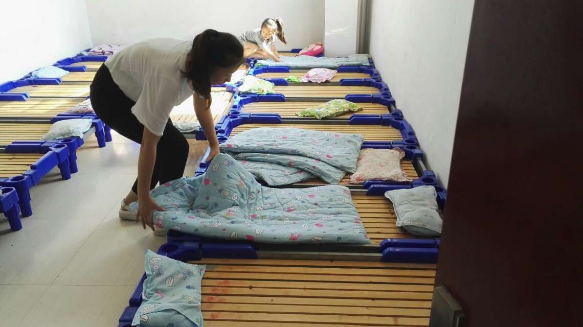 3日下午,小朋友们午休结束,团队成员帮忙整理床铺并将被子拿到外边晾晒。两日的接触后,小朋友们已经接受团队成员们,接着在老师的指导下,团队成员分组帮小朋友们梳头、穿鞋,整理衣服。在此过程中,小朋友们因为刚起床还不很高兴,团队成员一边与他们交流吸引注意力,一边快速的工作。
