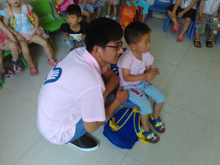 在接触过程中,为了加深对小朋友的认识,团队成员并没有直接与小朋友们接触,而是三三两两一组,到不同班级去观察,通过对不同班级孩子们的观察,团队成员们互相交流,并提出观察到的一些问题以及突发状况的应对措施。下午,团队成员分成三人小组,在幼儿园老师的带领下进入班级,通过自我介绍与小朋友们认识,并在老师的介绍中引导小朋友们自我介绍。在相互认识过程中,小朋友们有些腼腆,说话也很小声,有时也说错或说不清,这个时候团队成员就耐心引导小朋友们,并不发笑。