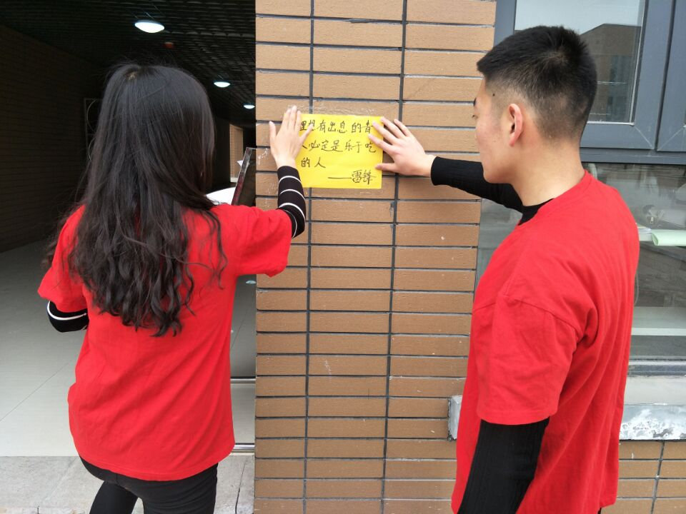 活动主要以部门为单位,同学们通过在校园贴"学雷锋"的标语、打扫卫生、整理校园自行车等形式进行志愿服务!充分展示当代大学生朝气蓬勃、健康向上的精神风貌,不仅促进我院精神文明建设,也给同学们创造一个良好的学习环境。