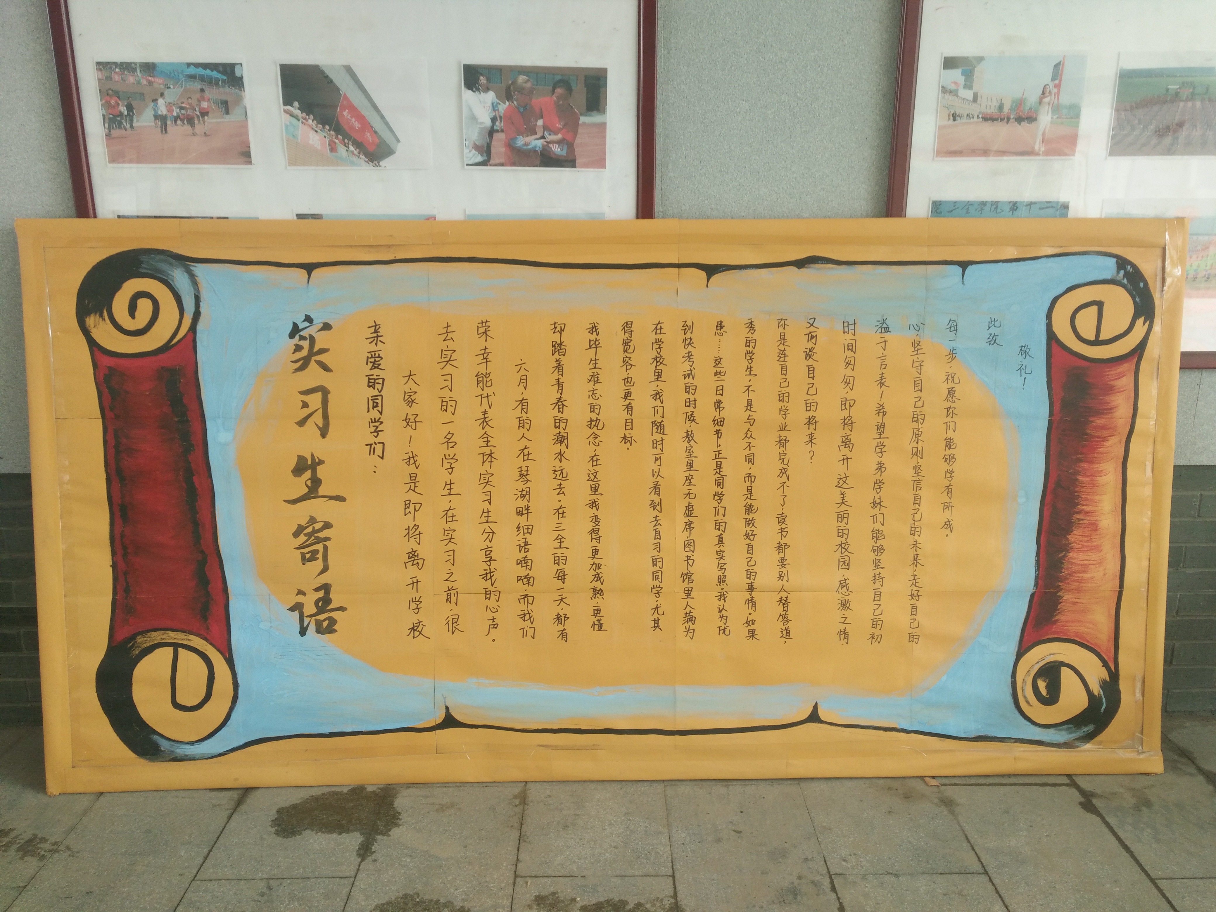 实习生离校时也流露出浓浓不舍之情,他们合影留念,似乎想把学校的一草一木全都带走。书院门洞内摆放了全体实习生的寄语展板,朴素的色彩,简洁的话语,表达了实习生对学弟学妹的勉励以及对实习生活的展望。他们说:“坚持初心,坚守原则,坚信未来,走好人生的每一步。”