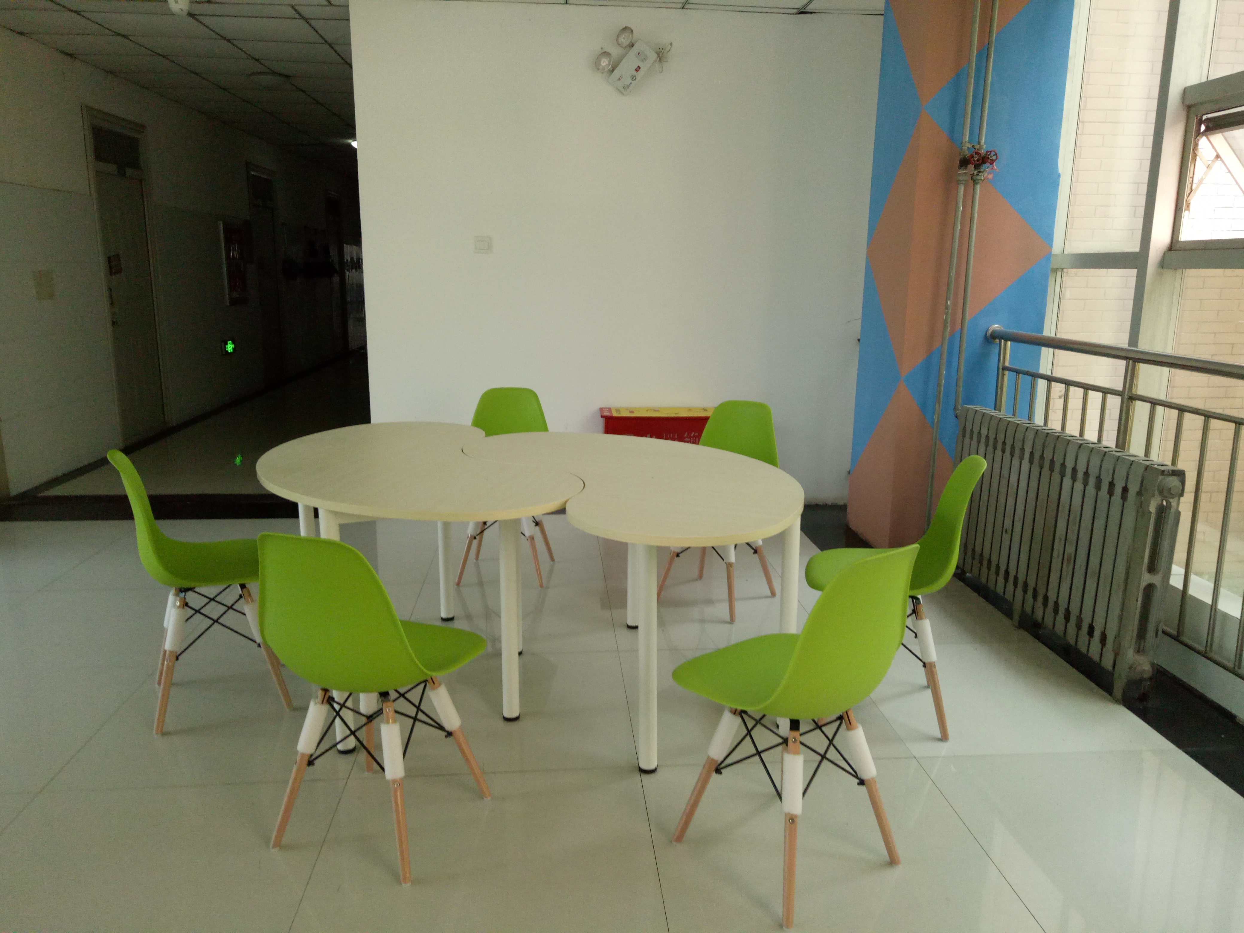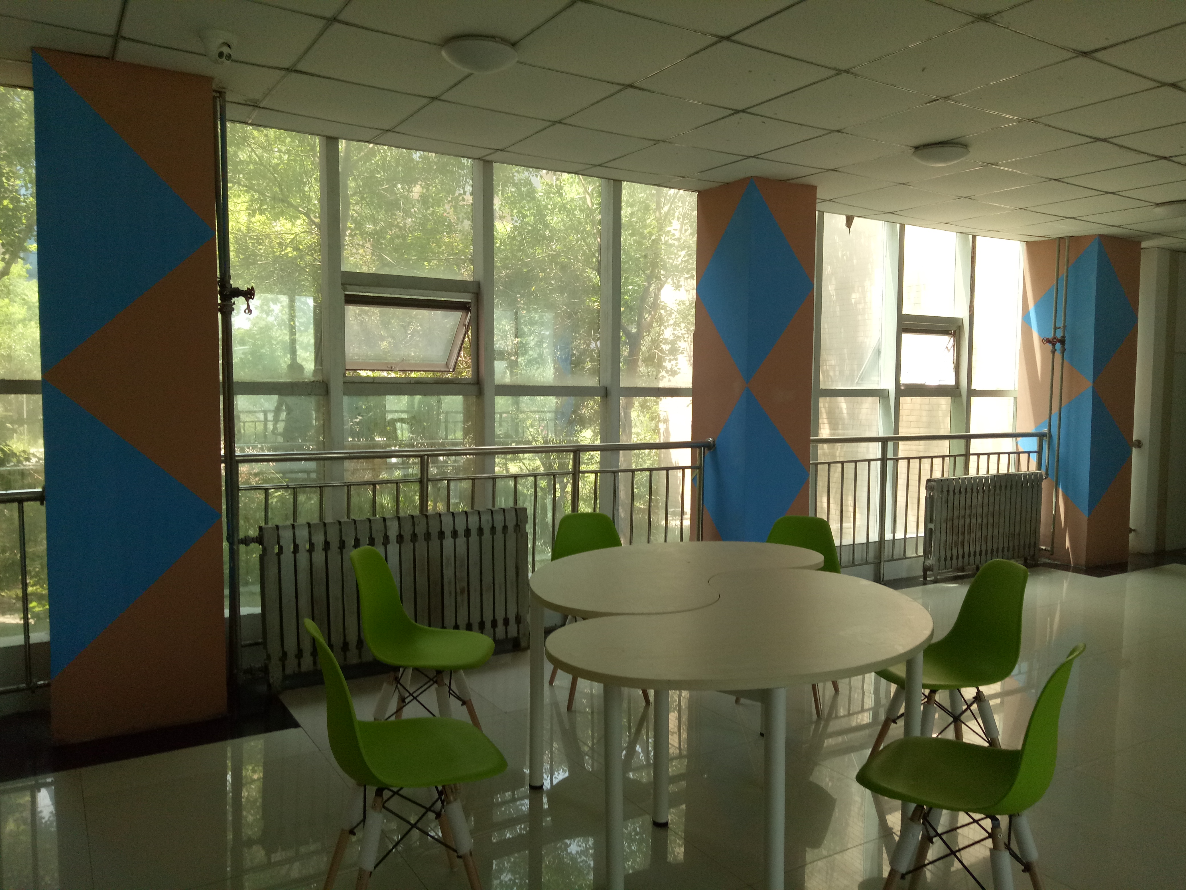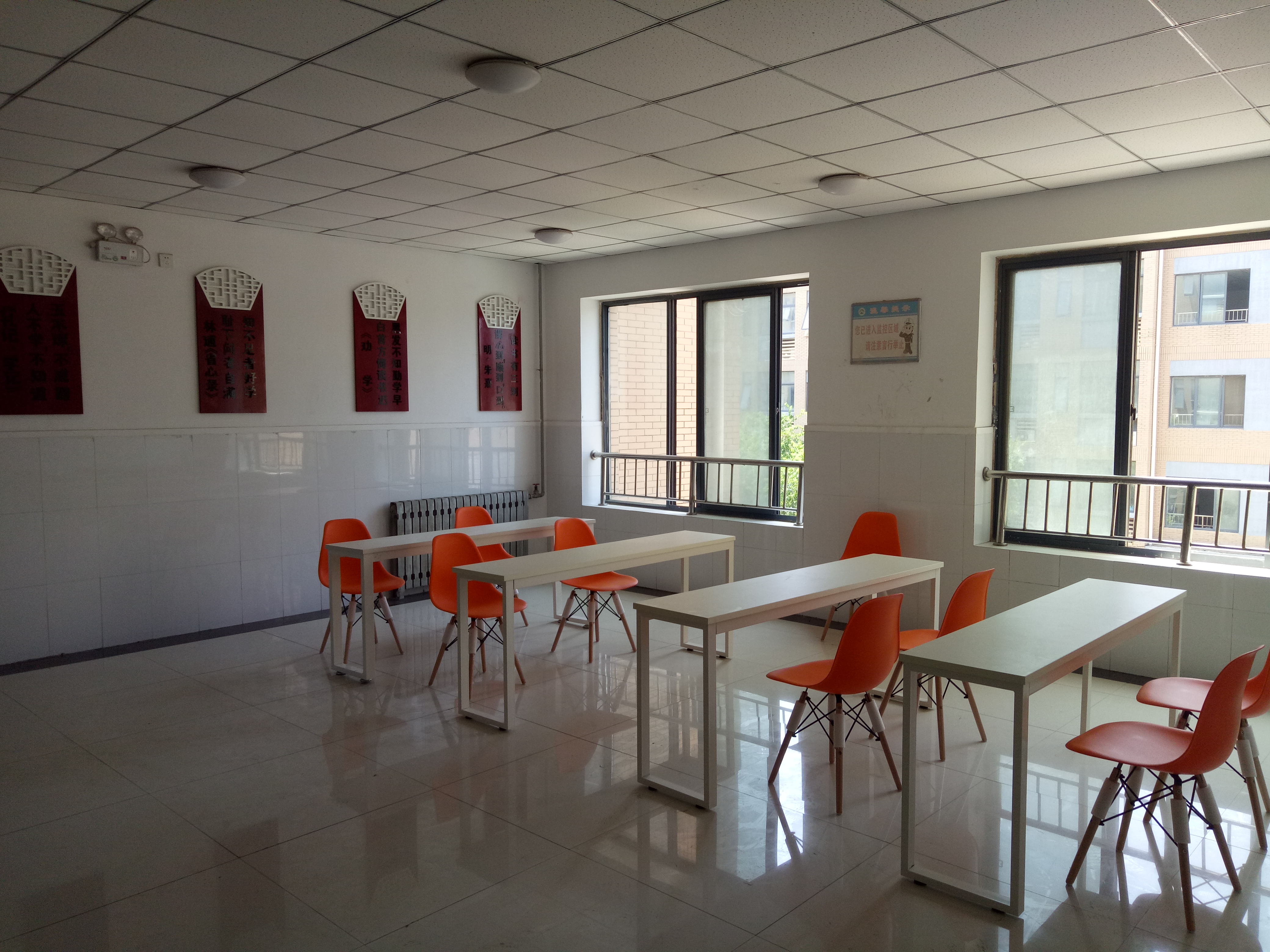 连廊处设有小型组合会议桌、讨论小黑板,是供老师和同学们交流、休息的场所。工作学习之余,坐在这里,喝一杯清茶,读一本好书,看看自己成长的照片,或与三五师长、同学讨论生活、学习中的大事儿小事儿,分享平日里的快乐与苦恼,温馨融洽、惬意舒适。楼梯间张贴标语壁画,图文并茂的墙壁语言从不同侧面为学生提供了一个展示自我,激励自我的平台。