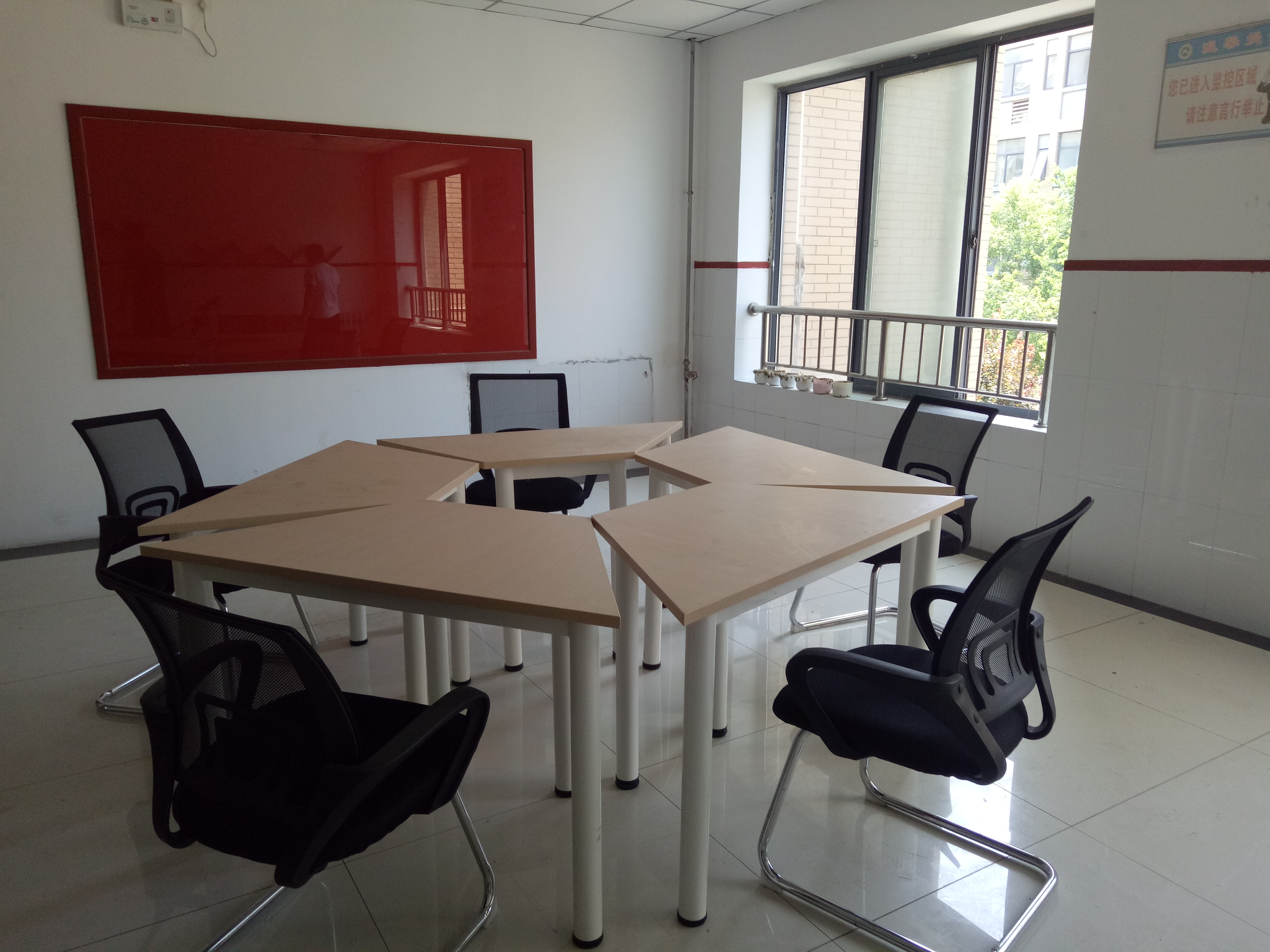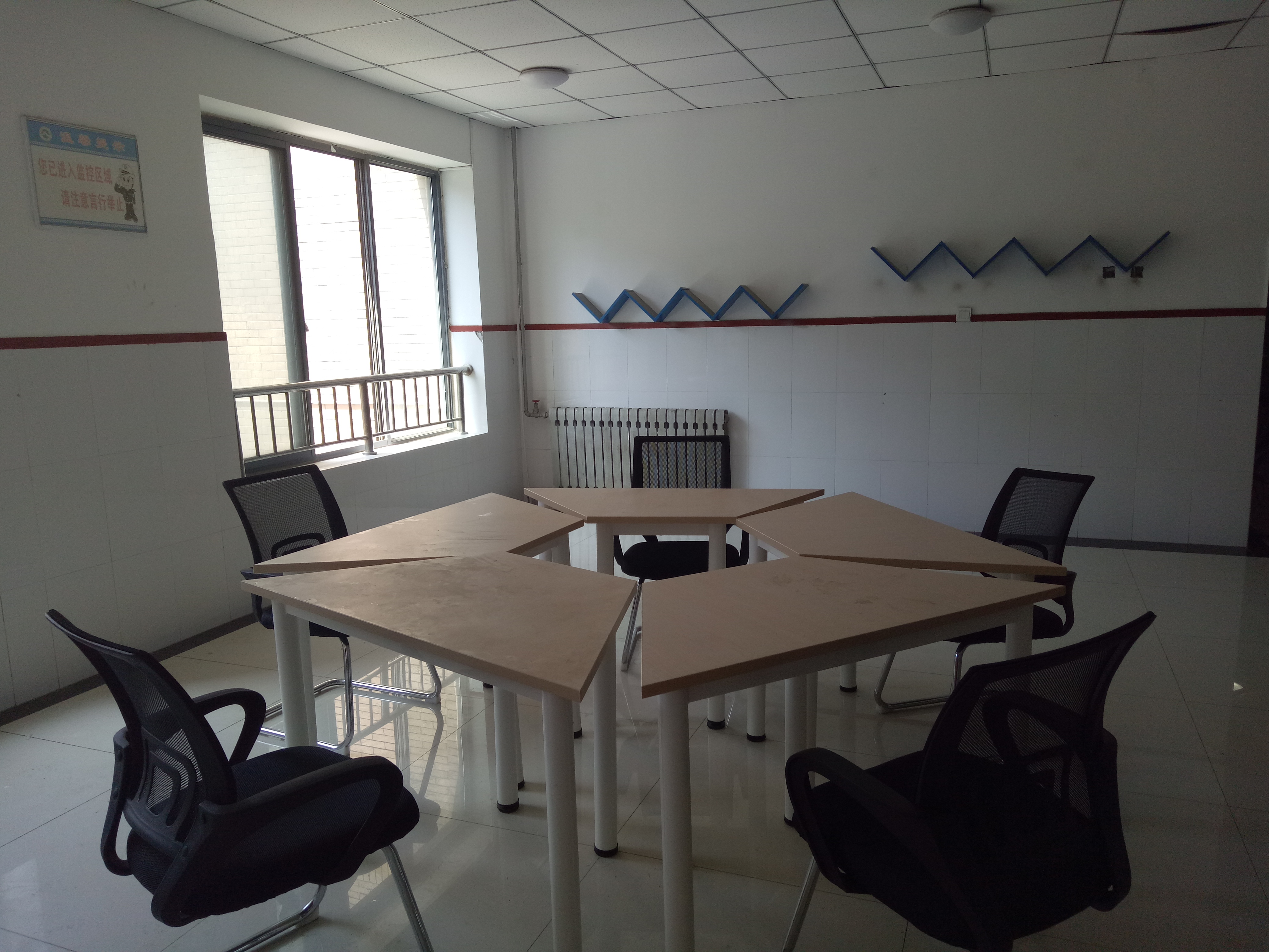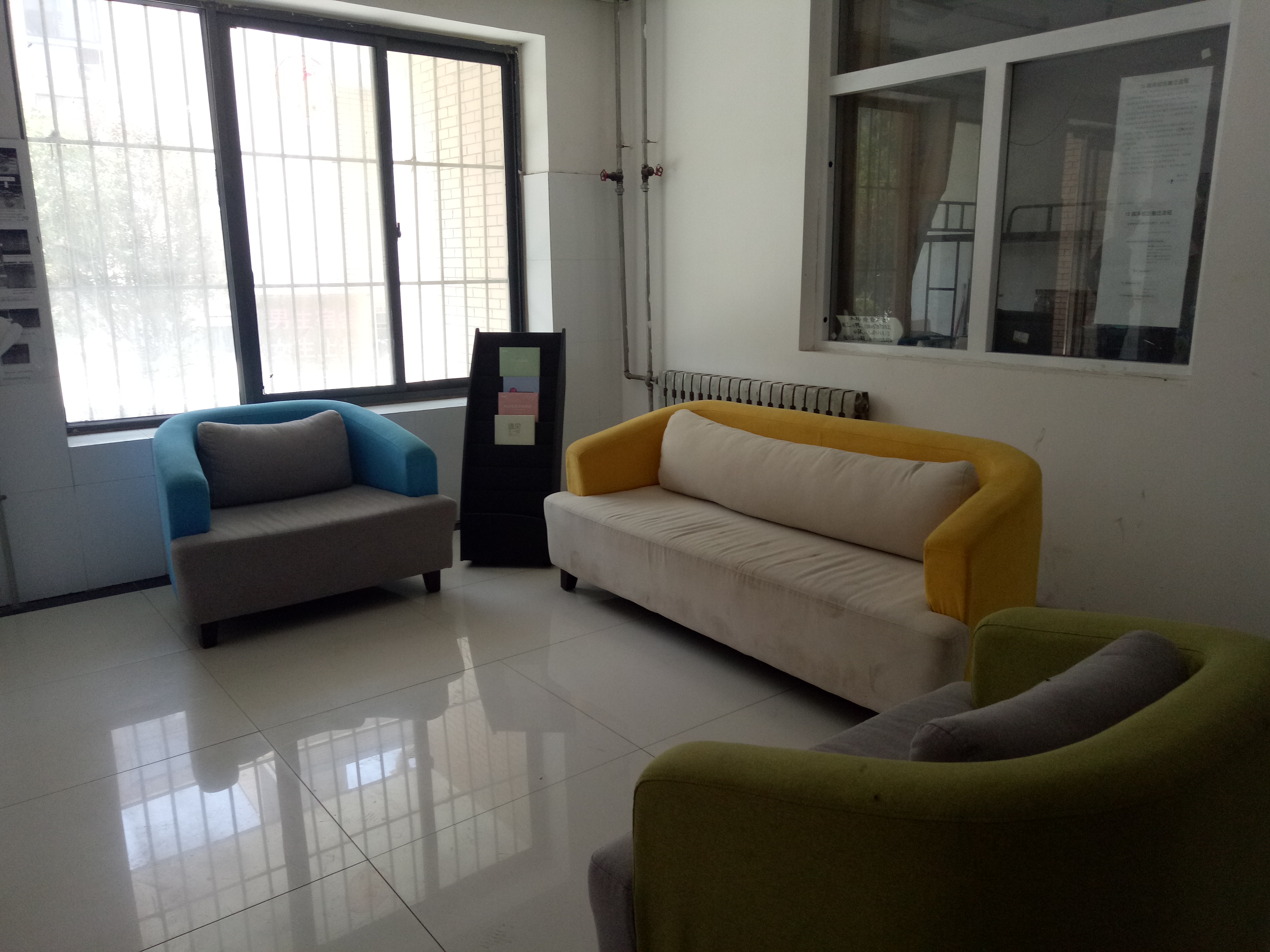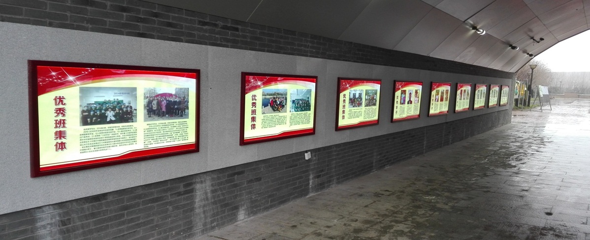 连廊处设有小型组合会议桌、讨论小黑板,是供老师和同学们交流、休息的场所。工作学习之余,坐在这里,喝一杯清茶,读一本好书,看看自己成长的照片,或与三五师长、同学讨论生活、学习中的大事儿小事儿,分享平日里的快乐与苦恼,温馨融洽、惬意舒适。楼梯间张贴标语壁画,图文并茂的墙壁语言从不同侧面为学生提供了一个展示自我,激励自我的平台。