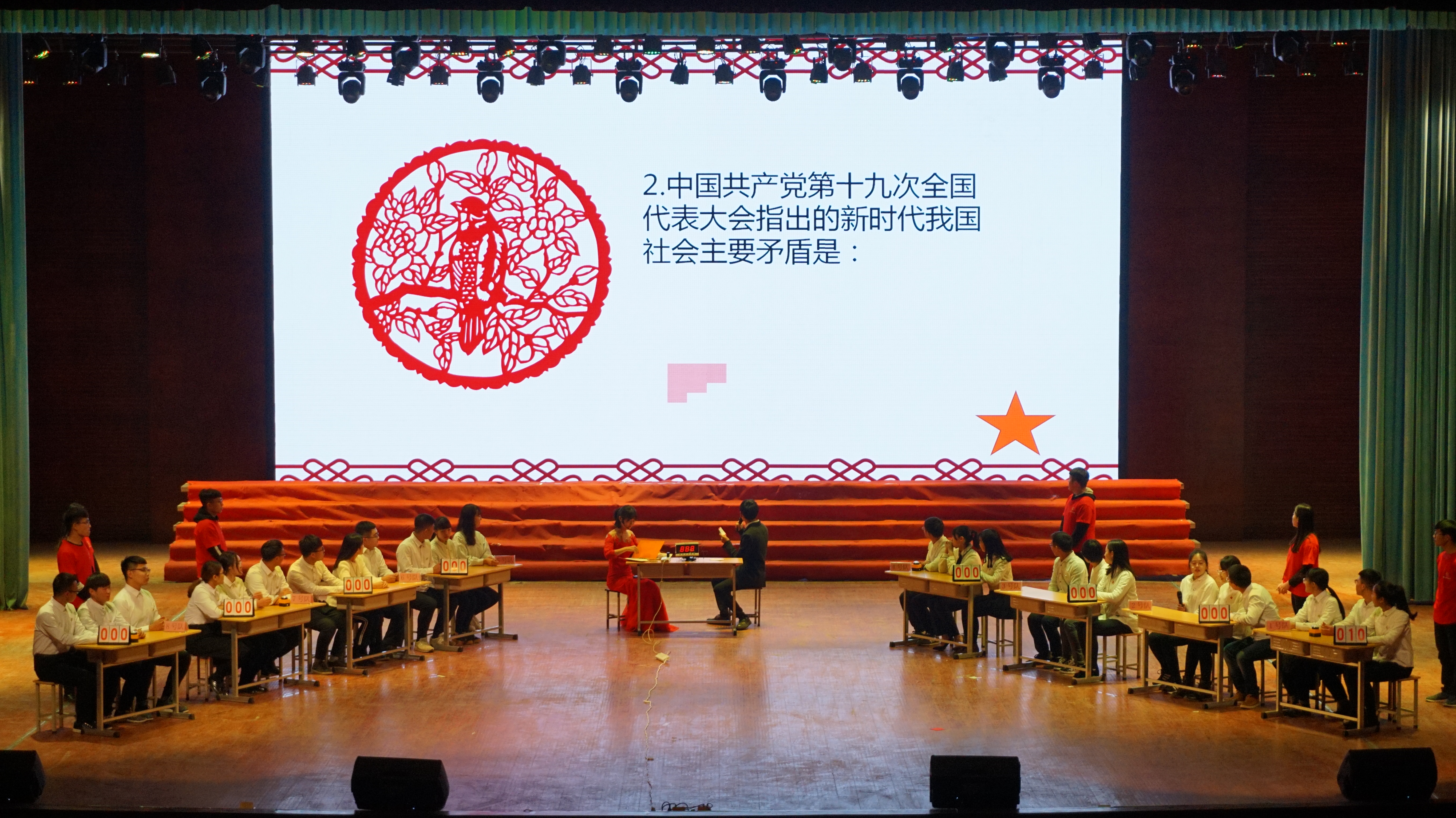 活动以歌曲、情景剧、知识竞答的形式展开,羲和书院在全院范围内选拔出党员、预备党员、入党积极分子共32位选手,组成8支代表队展开角逐。开场视频回顾了我党一大到十九大以来的巨大成就,全场肃立,奏唱国歌,气氛庄严。歌曲《永远跟党走》以舒缓轻柔的曲调勾勒出广大人民群众对党和国家的深情厚谊。情景剧《难忘红蘑菇》讲述了以邓稼先为代表两弹元勋在条件极其艰苦的情况下制造出国之重器原子弹的故事。知识竞赛共分为必答题、抢答题、风险题三个环节,题型分为文字题、图片题、音频题三类,文字题包括了中国共产党第十九次全国代表大会的主题、习近平新时代中国特色社会主义思想是全党全国人民为实现中华民族伟大复兴而奋斗的行动指南等内容;图片题中的G20峰会、嫦娥号飞船、辽宁号航母、一带一路、朱日和阅兵则图片展现了十八大以来中国的重大事件和重大变化;音频题采用了听红歌猜歌名的形式,让同学们重温了东方红、歌唱祖国、走进新时代等经典歌曲。在十九大知识竞答环节中,队员们赛前充分收集资料,比赛中反映敏捷,沉着应对。在必答题环节,各队比分咬的很紧,不相上下。抢答题环节参赛选手们快速抢答,为自己队伍荣誉而努力。最后大分值的风险题更掀起整个竞赛的高潮。