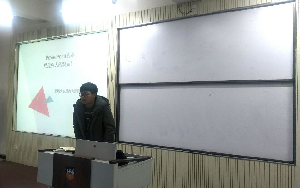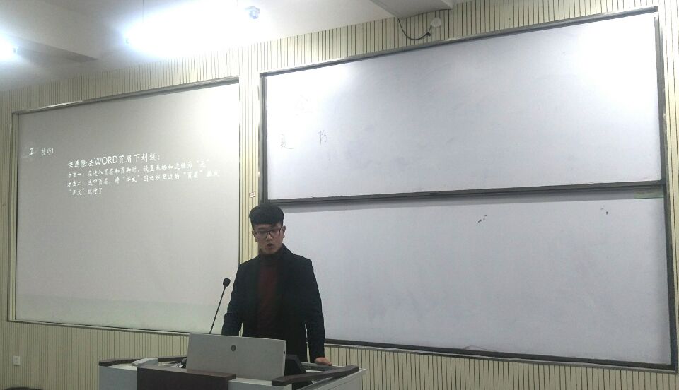 首先,干事孔海莉从新闻的标题、导语、主体等方面给大家讲解了新闻的结构特点。她简单介绍了倒金字塔结构、顺序意识,强调了写新闻稿要讲究真实性、时效性、准确性和简明性。接着,干事段子毅向大家分享自动化软件使用技能。他生动形象地描述了办公软件的作用,并传授了“如何快速除去WORD页眉下划线”、“分页符与分节符”等实用技巧。最后,刘磊从PPT的关键性原则、设计赏心悦目的PPT、PPT的常用功能与实用技巧、从熟练到善用工具四个方面阐述了“PPT的三十六计”。整场讲座秩序井然,干事们精彩的演讲赢得了观众的阵阵掌声。