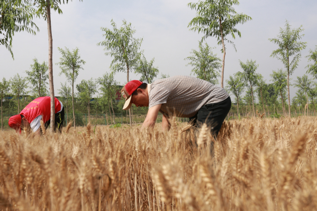 为了争取更多的收麦时间,党员志愿服务队于早晨七时许就准备完毕,来到原阳县原武镇的一块麦田,金黄的麦田里,志愿队的红色队服显得格外显眼。由于同学们大都没有割麦经验,崔书记带头,亲自给同学们传授割麦技巧和注意事项,同学们积极学习并快速掌握了割麦方法。随后,志愿服务队有序分成了七个小队,各队分工明确,各司其职,割麦工作有条不紊的进行。炎炎烈日下,崔书记和老师们充分发挥党员模范带头作用,身先士卒,手举镰刀,埋头苦干。同学们在老师们这种不怕吃苦,敢于担当的精神激励下,热情的投身于当前的工作之中。