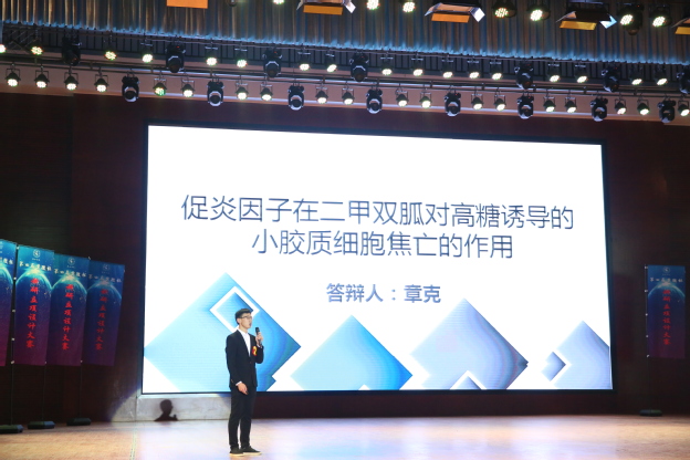 经过初赛大浪淘沙般的筛选,共有12支团队脱颖而出挺进决赛。决赛共分为项目陈述和评委提问两个环节。首先由各个团队代表依次上台对科研课题进行陈述,陈述范围涵盖研究背景、选题目的及意义、研究方法、进度安排与预期成果、创新性等方面。其中,课题《促炎因子在二甲双胍对高糖诱导小胶质细胞焦亡的作用》准确采用了对照分析、文献检索、细胞水平观察等研究手段,科学的设计思路获得了评委的一致好评。课题《河南省妇女围绝经期综合征流行病学调查》选题适宜,新颖,项目可行性高,精彩详细的阐述也赢得了评委们的认可。答辩过程中,评委们对每个课题的创新点做了点评,同时一针见血地指出了不足之处并提出改进意见,帮助选手明确研究方向、优化实验方法、增强可行性与创新性。答辩结束后,李智对选手们的研究方向给予了高度的肯定,并鼓励同学们钻研本专业热点问题的同时也要提高创新能力。随后,校园歌曲大赛冠军蒋政演唱歌曲《让我留在你身边》,优美的旋律激励着勇敢的羲和少年明天一定比今天更好。之后,主持人宣布比赛结果。最终,章克团队获得特等奖,张可可团队获得一等奖,李彦青、袁煜、吴勇、甄家训团队获得二等奖,肖宁宁、刘译泽、王晨蕊、王倩南、刘洋、张文渊团队获得三等奖。最后,赵冰董事长对本次大赛进行总结,他称赞本次参赛课题新颖,内容充实,同时也希望同学们能够培养对科研的逻辑思维能力。并对同学们说:“医学道路虽然坎坷,但明天一定更好,希望同学们能够再接再厉,勇敢前行。”