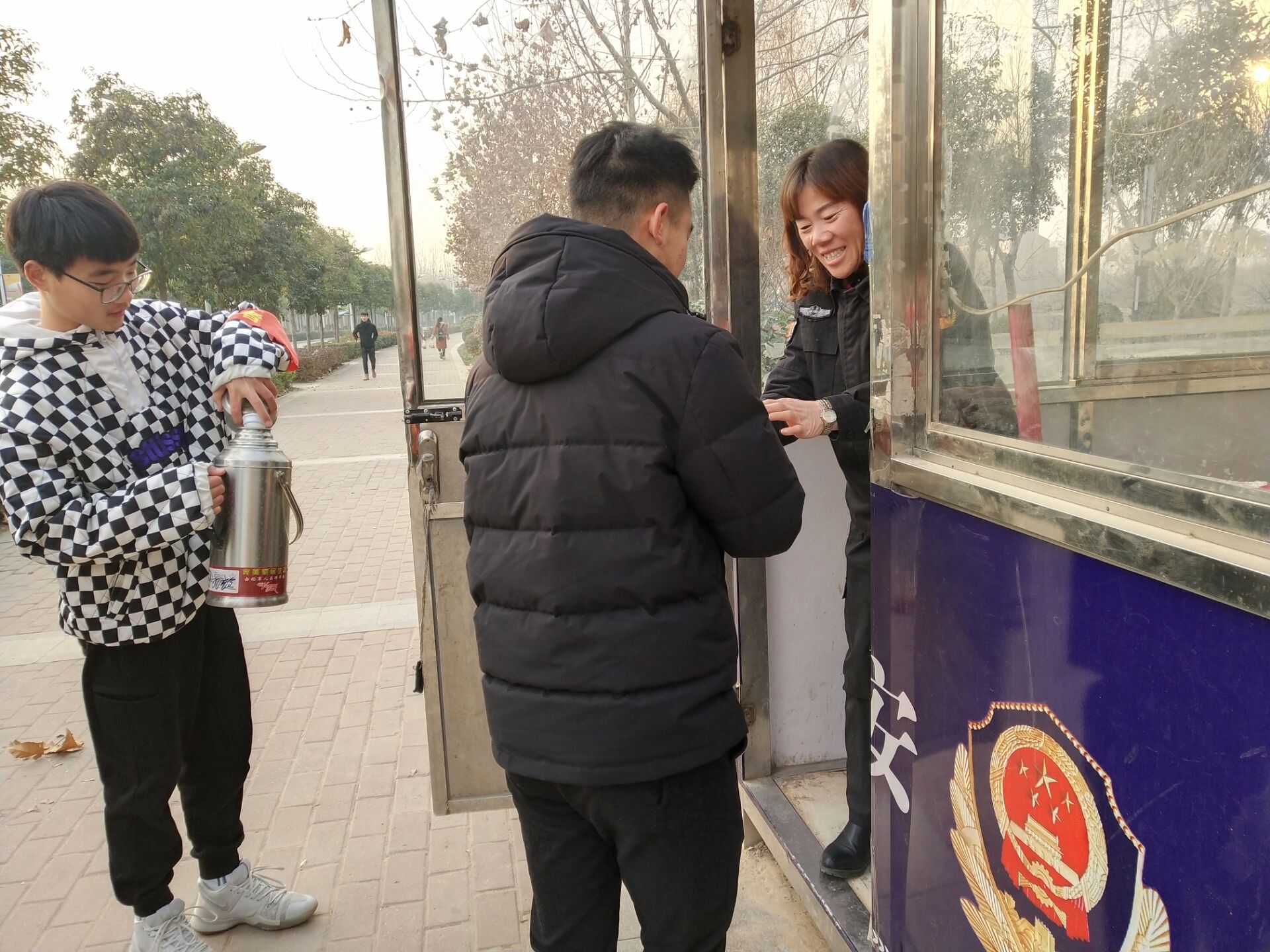 活动过程中,志愿者们携带着水壶以及纸杯,跟随负责人在新老餐厅以及校园各个主干道上为校园辛勤劳作的工作人员送上冬日里的一杯热水。志愿者们与他们进行亲切交流,了解他们的工作内容,为他们在寒冷的冬日送去一丝丝温暖。递上水的那瞬间,他们的表情呈现出来的是感动、是温暖、是惊喜、更是感谢。志愿者的一声声问候、一句句关心,似乎给这份辛苦减轻了一分。同时,他们脸上的笑容感染着每个认真生活的人,每个努力向上的人。