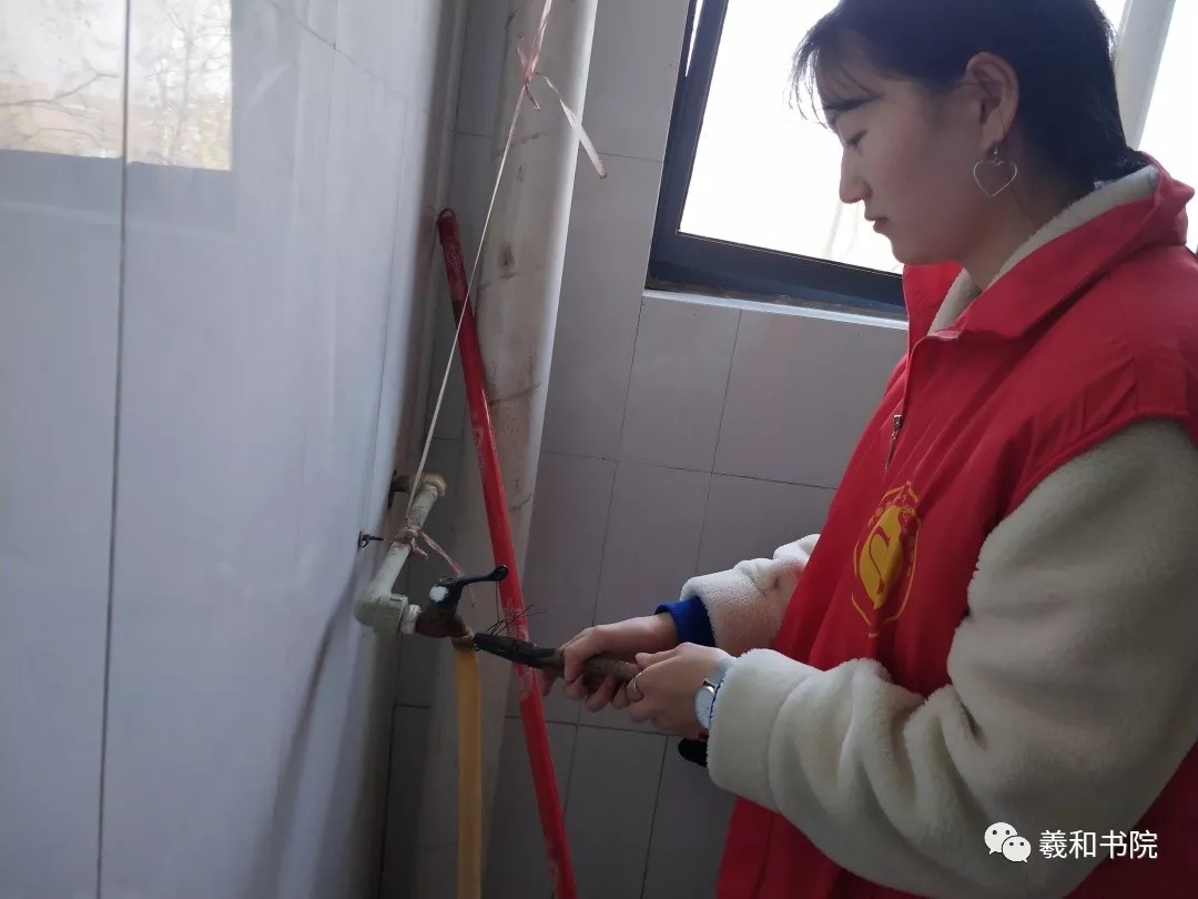 活动开始时,志愿者们为维修工人引路打开宿舍门,帮助维修工人拿维修工具,检查各个宿舍的灯泡是否需要二次维修,并为维修工人提供板凳支持换灯泡工作。维修工人也很有耐心的为志愿者讲述维修灯泡的技巧,以及爱护灯泡的方法。在此过程中,志愿者与维修工人搭配得当,分工协作,维修效率极高,为工作人员减轻了很多负担。70个宿舍的水管、空调、门锁、灯泡,以及三个公共区域的洗衣机、照明灯等维修工作,平时工作人员一周的工作量,我们只用了两天便如数完成。活动最后,志愿者拍下了维修后物件的照片并写上记录人员及时间,以表示此次维修工作的完美结束。所谓“三百六十行,行行出状元”,不管是哪一个职业都需要无限热爱和高度的敬业精神以及细心耐心专心的品质。