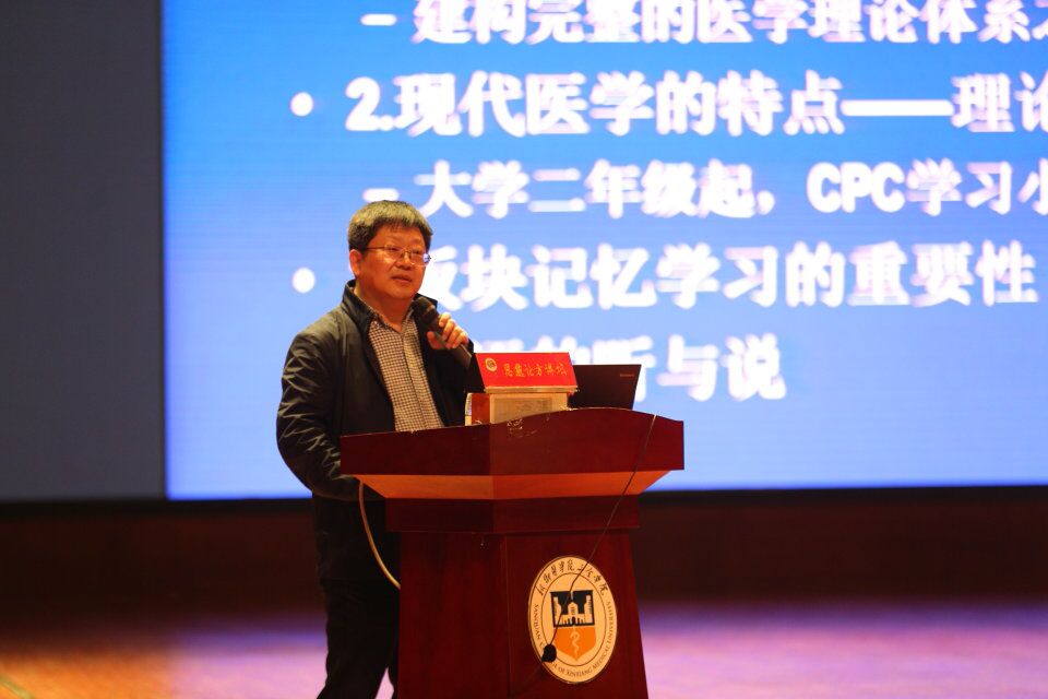 首先,崔书记对主讲人孟刚进行了隆重介绍。随后孟刚教授对其从事医、教、研、鉴工作35年的经验进行了分享。紧接着,孟教授自问自答:如果从头再来,还会选择学医吗?还会选择病理学吗?答案是肯定的。孟教授秉持着初心,对现代医学特点、理论体系等方面进行分析,给在场同学介绍了不少学习方法,并强调了板块记忆学习的重要性。亲切平和的语调,理论与实例的结合,使得在场同学听得及其入神,一阵阵发自内心的掌声是对孟教授最诚恳的肯定。