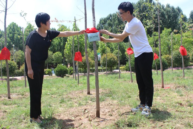 活动二,“羲望之树,继五四之薪火”。在党旗和团旗的带领下,同学们一路上伴着团歌去往后方林地,接受2019届优秀毕业生向书院捐赠的希望之树,刘小磊书记沿途向大家讲解希望之树和本次活动的意义。到达“羲望之林”后,老师和同学们一同揭开由2014级学生党员代表向羲和书院捐赠的“希望之树”的幕布,并为其挂上希望之牌,希望新一届的青年能充分理解五四精神,积极肩负起爱国爱党的重任,并将这份精神传承下去。