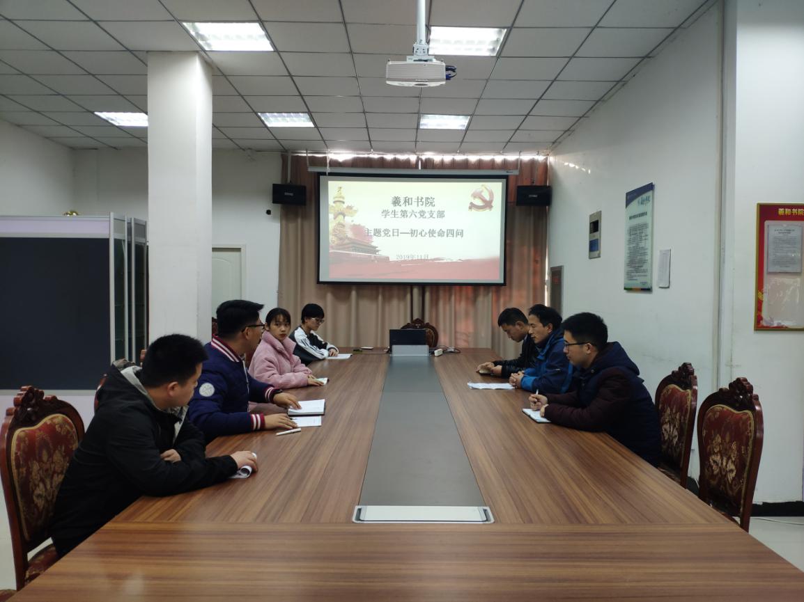 为深入推进“不忘初心、牢记使命”主题教育活动,引导广大党员同志在生活学习中使命在肩、主动作为。11月19日下午,羲和书院学生第六党支部在羲和书院会议室开展了“初心使命四问”主题党日活动。
