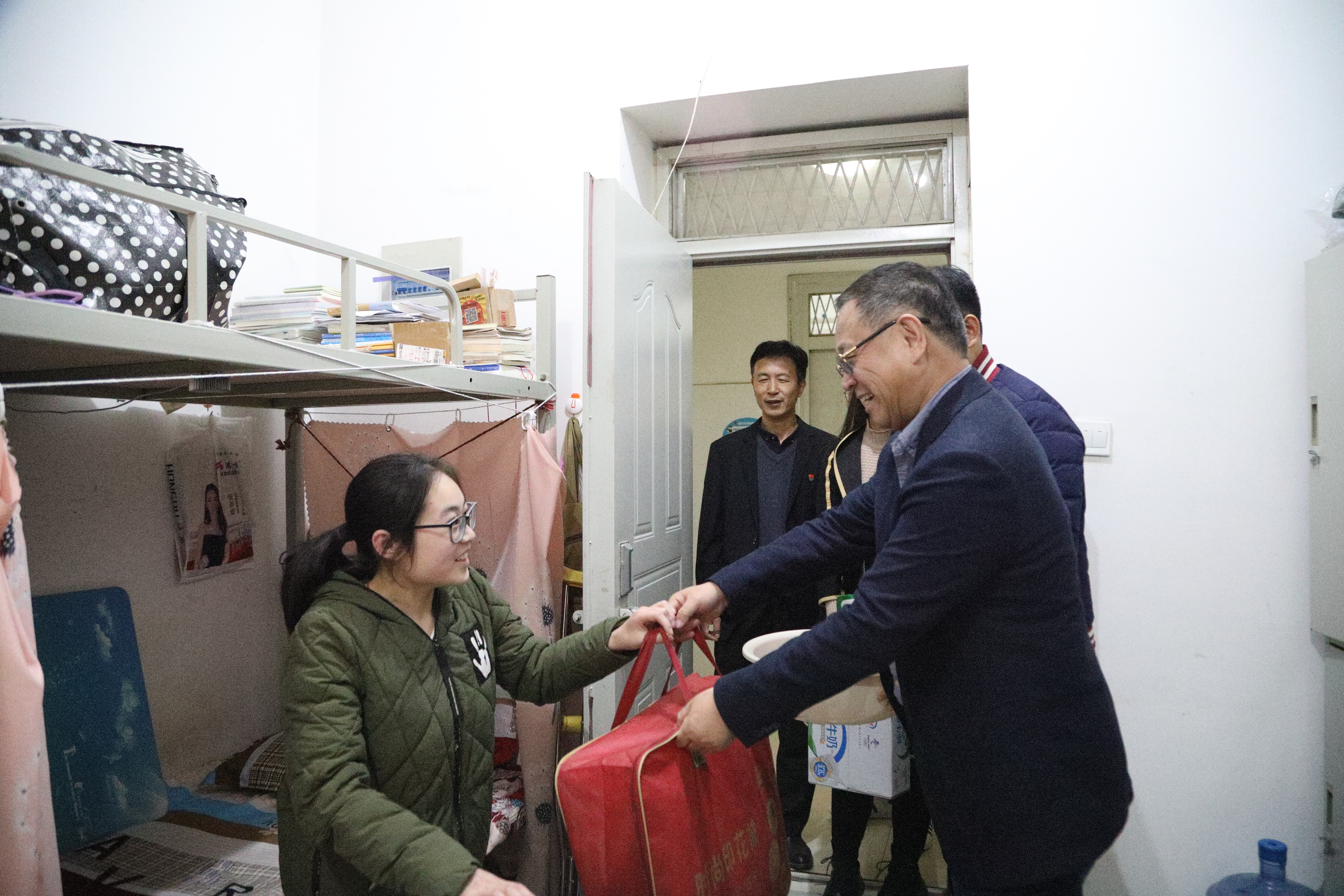 近日,在我校党委书记杨捷带领下,羲和书院党总支联合机关党总支深入学生一线调研,切实了解书院贫困生日常生活中的困难,践行党员初心使命,为学生办实事办好事解难事,给贫困生送温暖,帮助贫困生顺利度过寒冬。