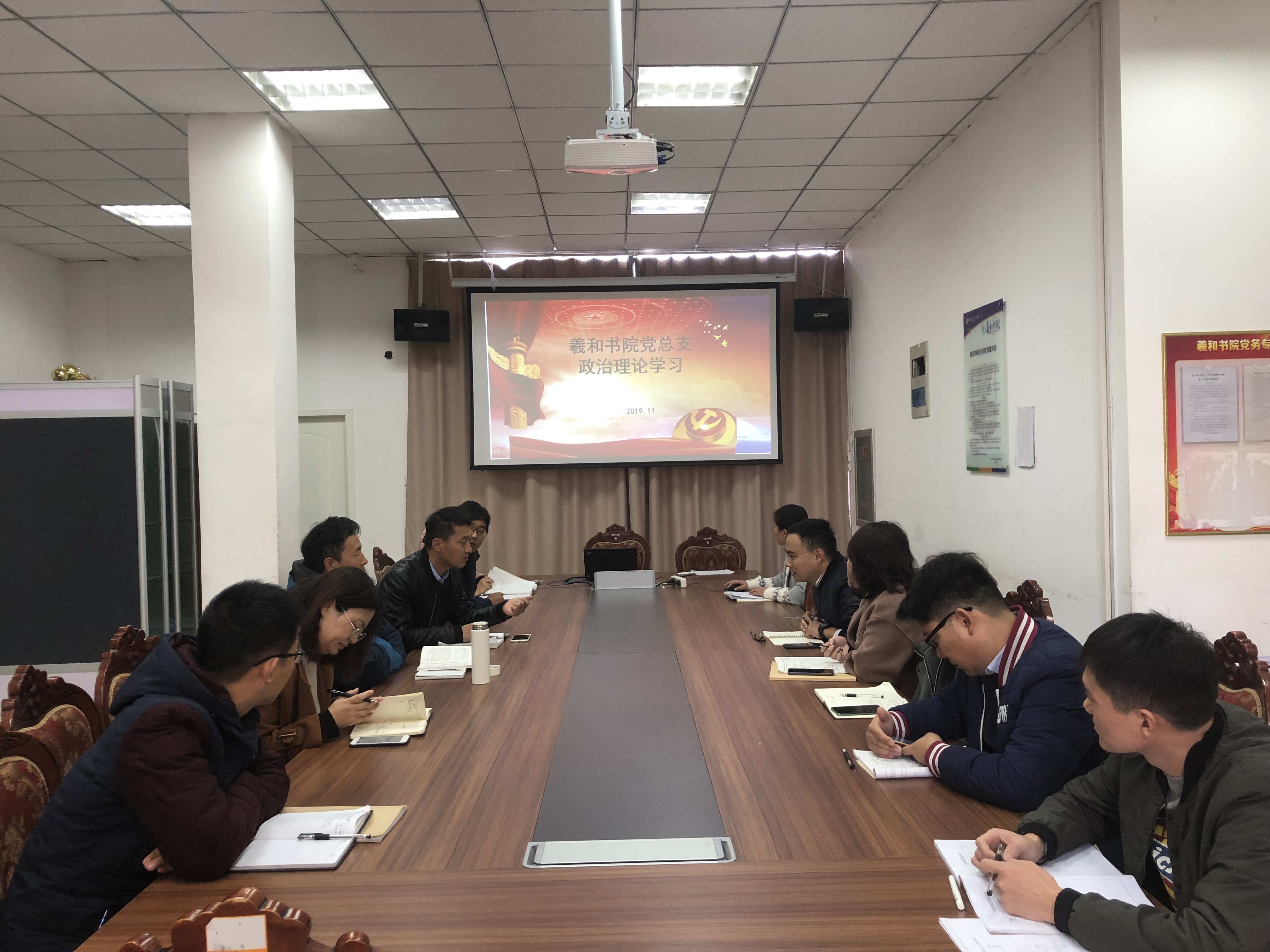 2019年11月18日上午,羲和书院党总支在羲和书院会议室召开11月份政治理论学习会议,习近平总书记:坚定信心埋头苦干奋勇争先 谱写新时代中原更加出彩的绚丽篇章和十九大报告。羲和书院党总支书记崔向前主持了本次会议,全体教职工党员参加此次学习。
