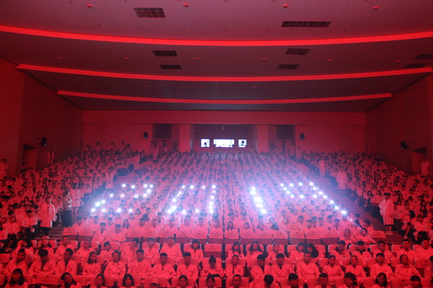 篇章一:千人舞灯海,星火映国旗。“我和我的祖国,一刻也不能割......”随着悠扬的歌声响起,同学们用手机手电筒依次摆出“1949”、“2019”、“70”的字样,寓意从1949年中华人民共和国成立至今已经历70年风雨。随后,全场观众打开手电筒,一面国旗从观众席第一排缓缓展开,载着全院学子心中无限的敬仰与信念向后排传递。国旗在一个个小小的灯光中闪耀,正如“星星之火,可以燎原”,效果震撼、寓意深远。