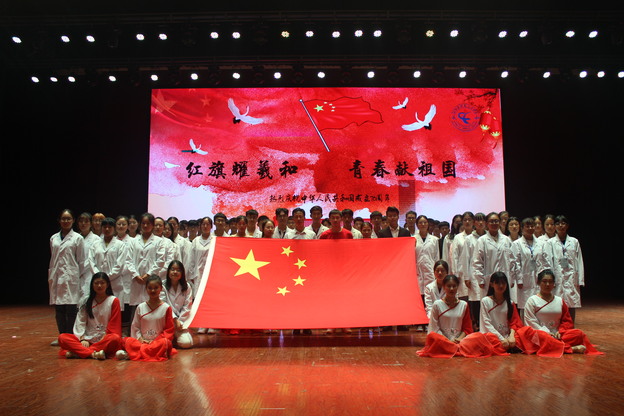篇章二:八方展风采,师生共祝福。柔中带刚的舞蹈《映山红》让观众仿佛感受到当年对红军归来的期盼与牵挂。随后播放羲和书院新老校区和七个教学基地包括2015级—2019级共4000余名羲和学子合拍的祝福视频。视频以1919年五四运动为引,包含了中国近百年的沧桑巨变,展现了建国以来祖国取得的伟大成就。视频结尾,在党总支书记崔向前的带领下,书院全体老师身着正装,佩戴党徽,站在国旗后对祖国深情祝福:“在新中国七十周年华诞之际,羲和书院党总支祝祖国更加繁荣富强,生日快乐!”,表达对祖国母亲70华诞的深情祝福。图书馆前,羲和学子们以方阵高高托举起国旗和党旗,并在后方摆出“70”字样的队形,祝愿祖国更加繁荣昌盛;校外培训基地的羲和学子在自己的岗位上守卫国民的健康,作为祖国医药卫生事业的守护者,由心地祝愿祖国母亲屹立不倒,国泰民安。接着,刘小磊副书记带领书院辅导员老师献上诗歌朗诵《我的祖国》。老师们激情澎湃,情绪饱满,充分表达三全人满腔的爱国之情。