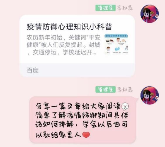 张佳佳,2017级本科生物制药专业74班的心理委员,为了疫情期间同学们的身心健康,她积极宣传我校心理支持服务项目,为每一位同学提供寻求心理支持的专业途径。她呼吁同学们利用假期时间去制定学习计划,明确未来的方向,为以后的学习与生活打下基础。有同学提出,在疫情期间,焦虑、愤怒等负性情绪经常困扰着自己,不知道如何应对负性情绪,对此,她告诉同学们要接纳负性情绪,理解和接纳自己这样的状态,告诉自己这是面对不正常情境的正常的反应,要允许它们的存在,不自责,也不指责和抱怨他人。在疫情期间,她通过转发我校心灵氧吧宣传的心理知识以及搜集各种心理解压小视频来帮助同学们做好自我身心调试,通过以上多种方法,帮助同学们增强心理调适能力。