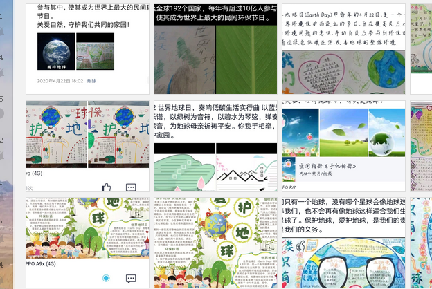 活动伊始,负责人认真发布群公告,让志愿者熟悉活动流程。公告发布约一个小时后,第一份作品破壳而出,其截图上的一抹绿色,让保护地球又增添了份希望。随后,群相册的截图越来越多,群消息99+的现象频繁岀现,志愿者的热情也随即被带动起来。在上传的截图中,有名志愿者这样写到:“人间知音难觅,校园草坪难培!树木拥有绿色,地球才有脉搏。”字里行间透漏着绿色新希望诞生的不易,更能触及人之心灵,能更好的培养人们爱护自然的意识。激昂的文字,热血的话语引导志愿者们的思想愈加活跃,活动也在这种良好的氛围中有条不紊的向前推进。24日,活动接近尾声,负责人开始整理志愿者上传的截图。如切如磋,如琢如磨,精巧的画工展示岀志愿者追求卓越的品质;蓝绿交织的图画象征着人类对地球,对大自然的呵护。志愿者在微信,QQ上发布的海报展示着青年学生保护地球,呵护自然的呼声。同时,历时4天的志愿活动在随着群相册的停止上传圆满结束。