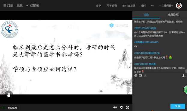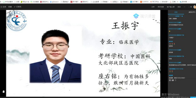 互动环节中,6位嘉宾依次回答了主持人提前在观众群收集好的问题。其中来自中国医科大学的王振宇同学在解答考研问题时,紧跟时事热点,语言灵活,言辞犀利且中肯。首先他提出了专业课复习的“抛物线”现象,即在考研复习的9月份左右,专业课的复习往往已经达到顶峰,所以在接下来的政治复习中一定不要完全放下专业课。然后他就“三本出身是否会受歧视”的问题进行了剖析,他指出,自身的优秀可以抵消所有的负面言论。在回答专硕与学硕方面的问题时,他联系当下社会形势及各研究生高校实际情况为我们进行了详细解答。过程中提到翟天临的学术造假事件强调了学术的严谨性,作为医学生,更是在任何阶段都不能放松学习。