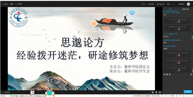 6月12日晚,赫鹿娟、王振宇、秦景娜、谷丰、张钜、李月明6位考研成功应届毕业生受邀做客羲和书院第二十二期“思邈论方”讲坛,在腾讯课堂线上平台开展了主题为“经验拨开迷茫,研途修筑梦想”的讲座。学业导师石晓卫教授、羲和书院党总支副书记刘小磊出席本次讲座,300名羲和学子及优秀辅导员共同聆听。