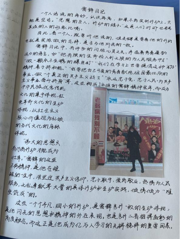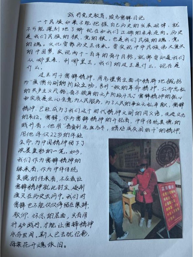 活动正式启动,参与活动的同学们接收到相关活动通知发后,开始跃跃欲试续写雷锋日记,要为雷锋续写更辉煌的人生。举办续写《雷锋日记》活动就是要用实际行动告诉人们,雷锋精神看得见、摸得着,是可以广泛推广的永恒价值坐标。活动进行时,参与活动的同学们怀着缅怀之情,重温雷锋故事,诉说着他“向上”的人生态度,“向善”的价值追求。归根结底,续写雷锋日记是一件快乐的事情,一方面,是对我们进行的道德教育和精神洗涤,另一方面,是爱的感念的传递,这种传递不仅在心里,更多的是流向我们整个社会。