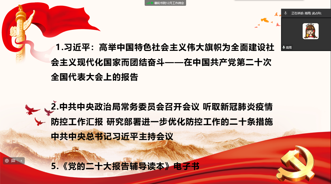 会议开始,羲和书院党总支副书记刘小磊领学了《求是》杂志发表习近平总书记重要文章《坚持人民至上》、习近平:高举中国特色社会主义伟大旗帜为全面建设社会主义现代化国家而团结奋斗——在中国共产党第二十次全国代表大会上的报告、中共中央政治局常务委员会召开会议 听取新冠肺炎疫情防控工作汇报 研究部署进一步优化防控工作的二十条措施 中共中央总书记习近平主持会议等重要文件。强调要认真学习贯彻落实党的二十大精神,坚持以新时代中国特色社会主义思想为指导,坚持中国共产党领导,坚持中国特色社会主义道路,高举爱国主义、社会主义伟大旗帜,引领广大师生切实把思想和行动统一到党的二十大精神上来,强化思想引领,以高度的使命感和责任感壮大新时代爱国统一战线,促进海内外中华儿女团结奋斗,为中华民族伟大复兴汇聚伟力。