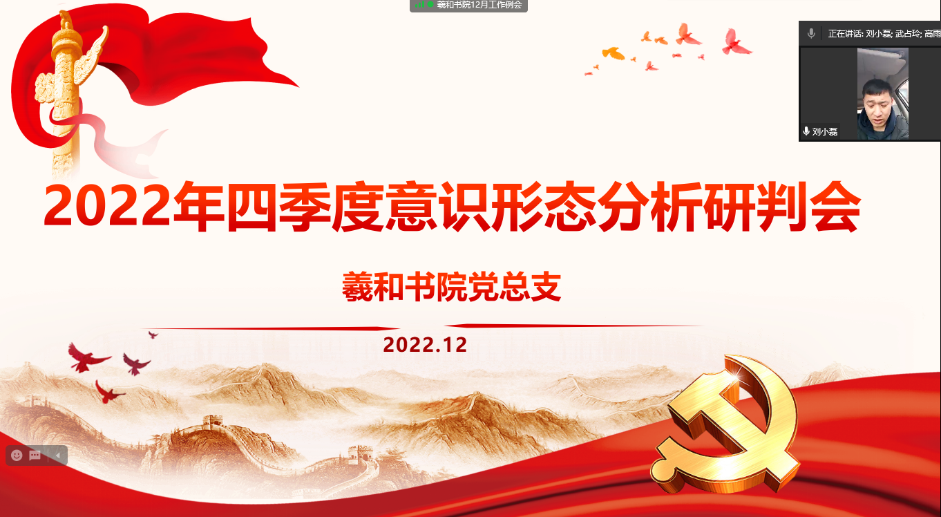 鉴于当前疫情严峻形势,面临寒假校园安全稳定、假期师生文明用网等问题,意识形态工作面临新的问题和挑战。为确保切实做好意识形态工作,夯实意识形态工作责任任,12月5日下午,羲和书院召开第四季度意识形态工作分析研判线上会议,书院全体教师党员参加。会议由羲和书院党总支副书记刘小磊主持。