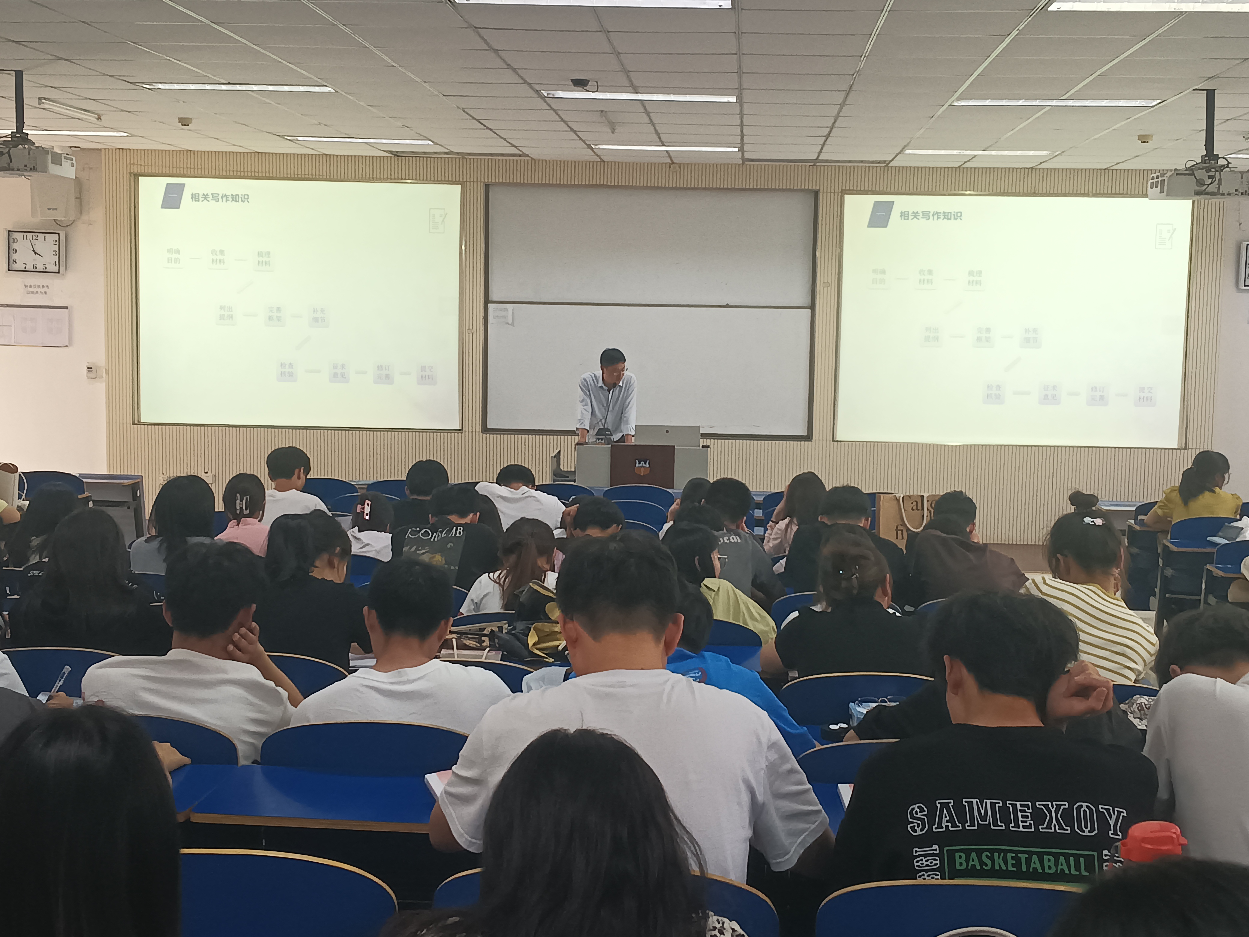 本次示范性授课的主题是写作与应用模块中的总结、报告单元。薛宏老师首先从课程近三年的变化入手,调研学生在雨课堂中对本单元内容的预习、了解程度。薛老师用“吾日三省吾身”来引导学生反省、总结对工作、对自己的重要性。