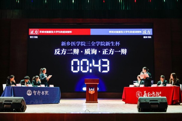 辩论,是语言与思想的碰撞,是智慧与灵感的交融。为教育引导2023级新生适应大学生活、尽快完成角色转变,同时助力其形成树立坚定的理想信念和爱国情怀,羲和书院联合通识教育学院共同举办了“启航‘全’世界,‘辩’响爱国情”新生杯辩论赛。决赛于10月31日下午,于闻德礼堂顺利落下帷幕,新乡医学院三全学院副院长薛宏、党委宣传部副部长王德胜、图书馆陈燕、校团委史良、第一届豫辩九州辩论赛最佳辩手程铎出席担任评委,学务部副主任兼团委书记马素娟、羲和书院党总支副书记刘小磊、智行书院院务主任孙媛慧、人文素质教育中心主任常岩婷等相关领导嘉宾出席本次活动,各书院六百余名新生参加观摩。
