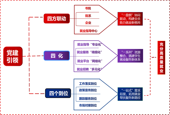 通过书院、院系、企业、就业指导中心四方联动,提升业务水平,加强就业分类指导,提升升学率,拓展就业平台,全员助力学生就业。