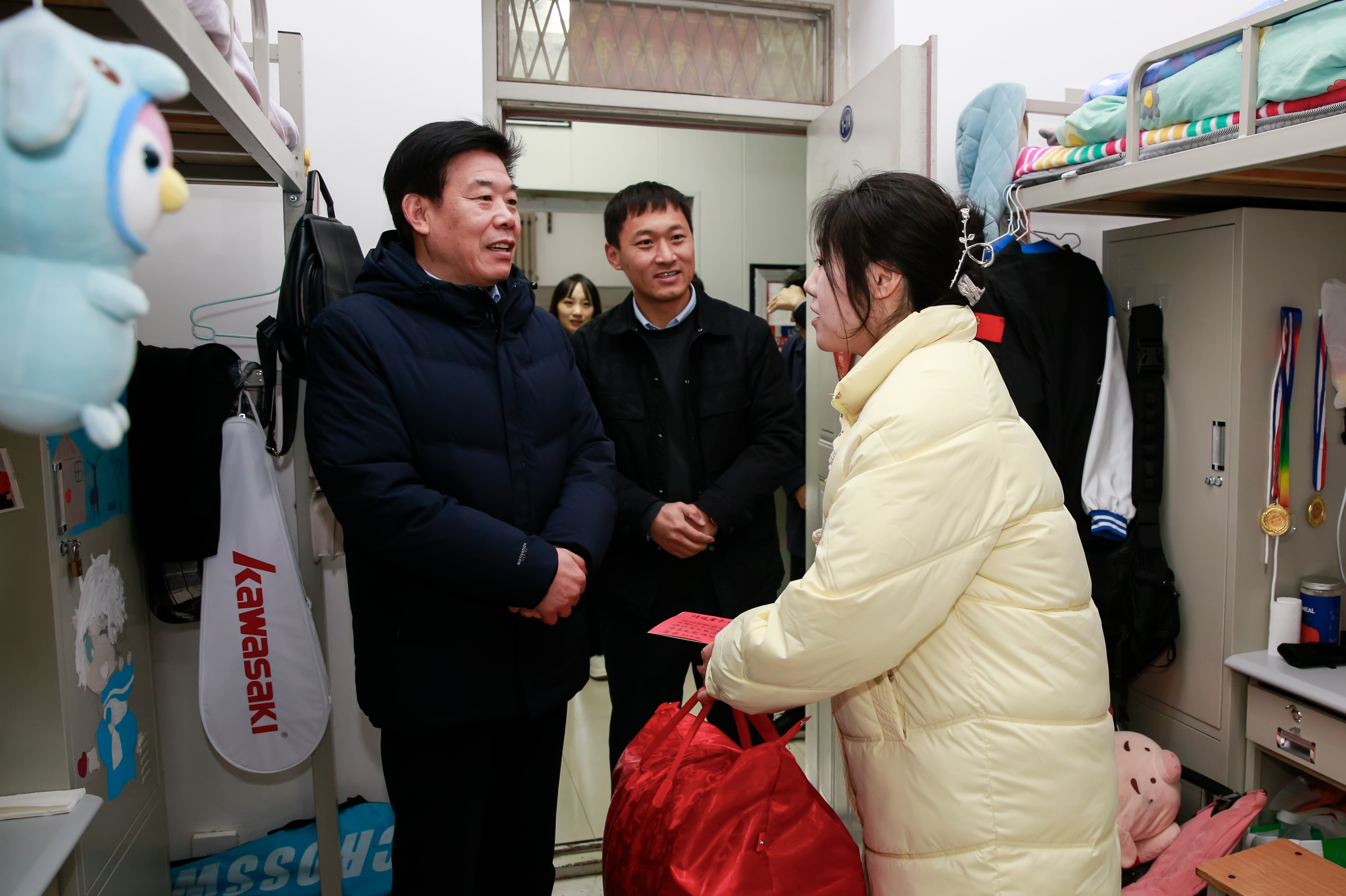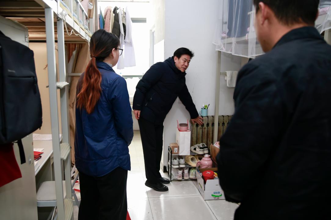 瑟瑟寒风,挡不住浓浓暖意;刺骨寒冬,抵不住慰问之情。一床床暖心的棉被、一张张温情的饮水卡、餐券、理发券,由校党委书记李庚亲自送到学生手中,他走进宿舍亲切地询问宿舍暖气是否正常,棉被是否够用,鼓励同学们:“一、要以积极向上的态度正确面对学习和生活中的挑战和磨砺,要志存高远、自立自强、勇于追求、不断拼搏;二、要常怀感恩之心,珍惜学校和老师对大家的关怀和帮助,懂得将爱心传递下去,用自己的努力帮助更多的人;三、要珍惜机会、努力学习、不断磨砺自己的意志,创造属于自己的奋斗青春,成为有理想、有担当、有抱负的有为时代青年。”同学们纷纷表示非常感谢学校的关心和帮助,时刻谨记老师的嘱咐和期望,永怀感恩之心、进取之心,努力提高自己的专业水平,将学校的这份爱心转化为实际行动,秉持感恩之心回馈学校和社会。