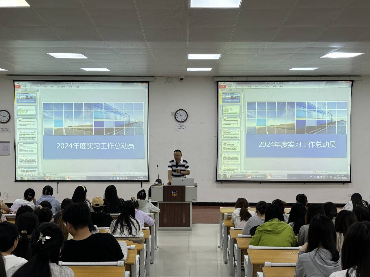 随后,李群涛就实践学习制度规定、安全注意事项、就业服务指导及手续办理流程、参军入伍动员等方面向全体同学进行宣讲。他特别叮嘱同学们要遵守学院和实习单位的有关管理规定,熟知实践学习过程中安全隐患点并确保全场景安全,同时树立以就业为导向的新学年学习计划,关注参军入伍等优质就业渠道,响应国家号召和社会需求,积极准备到国家需要的地方建功立业。