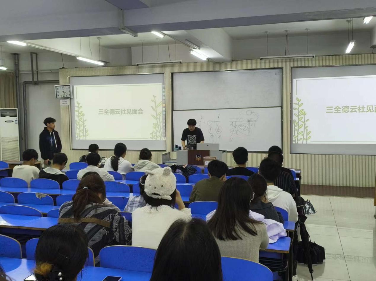 10月17日,三全德云社在谨学楼进行了本学期第一次社团见面会,本次见面会由社长张文博主持,社团干事分别上台进行自我介绍,向大家讲述社团的组成以及社团活动的开展,让社团成员了解本学期即将开展的社团活动的主题,与成员们进行沟通交流,听取成员们对于社团发展的建议,增加成员之间的交流互动。同时羲和书院孙玥老师向同学们讲述了对于社团的规划以及对于社团活动的建议,对社团的未来发展提出更高的标准和要求。