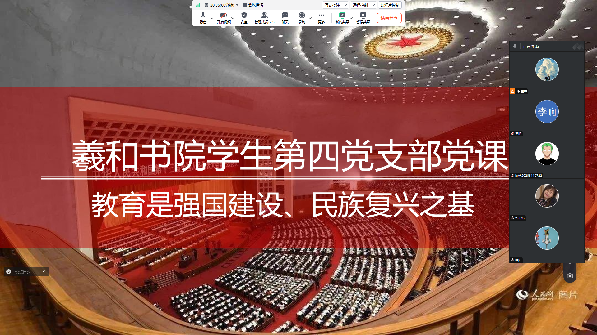 10月23日下午,羲和书院学生第四党支部书记王森同志为支部全体党员讲授了一场题为《教育是强国建设、民族复兴之基》的线上主题党课。此次党课旨在深入学习贯彻习近平总书记在全国教育大会上的讲话精神。