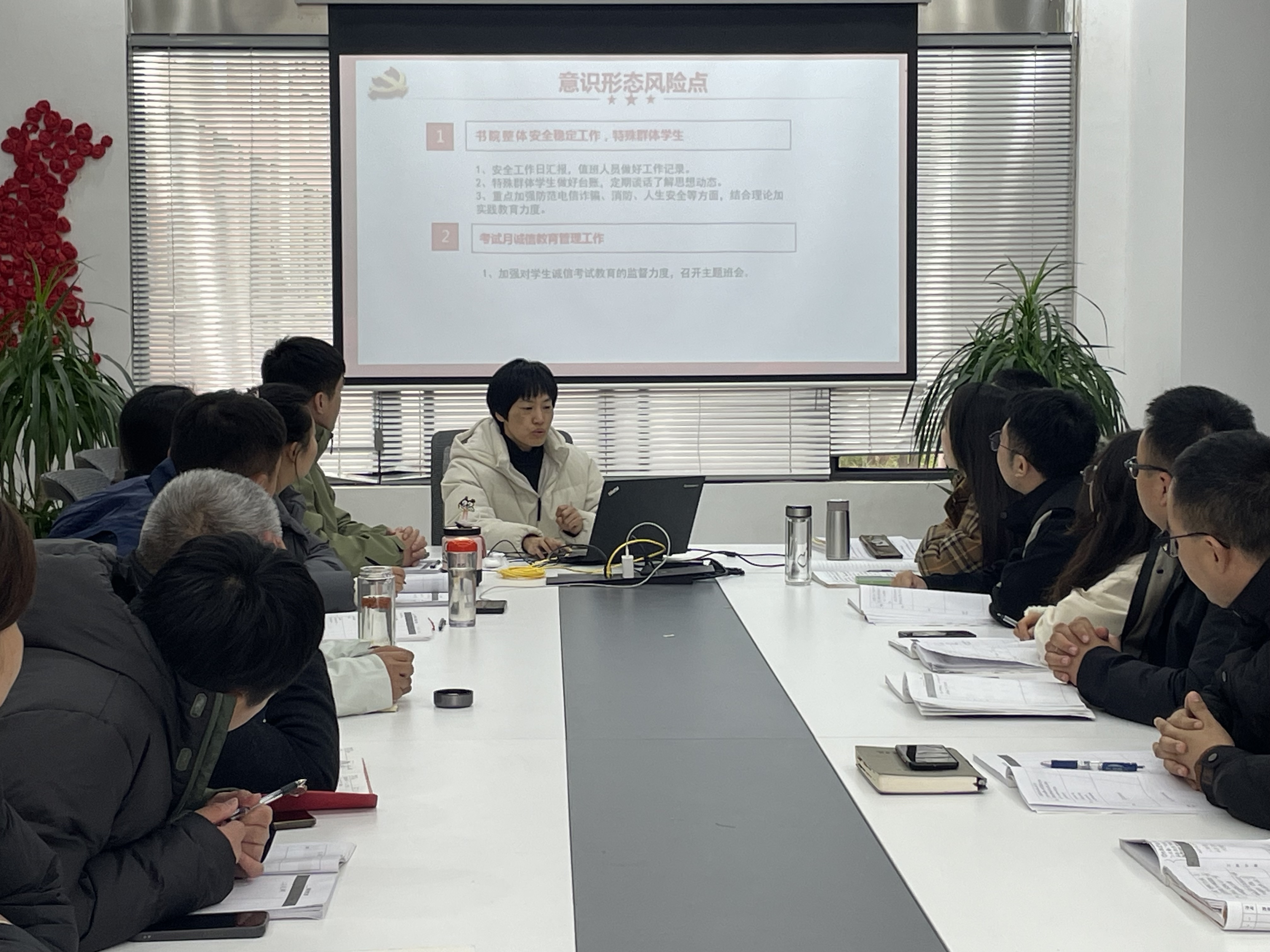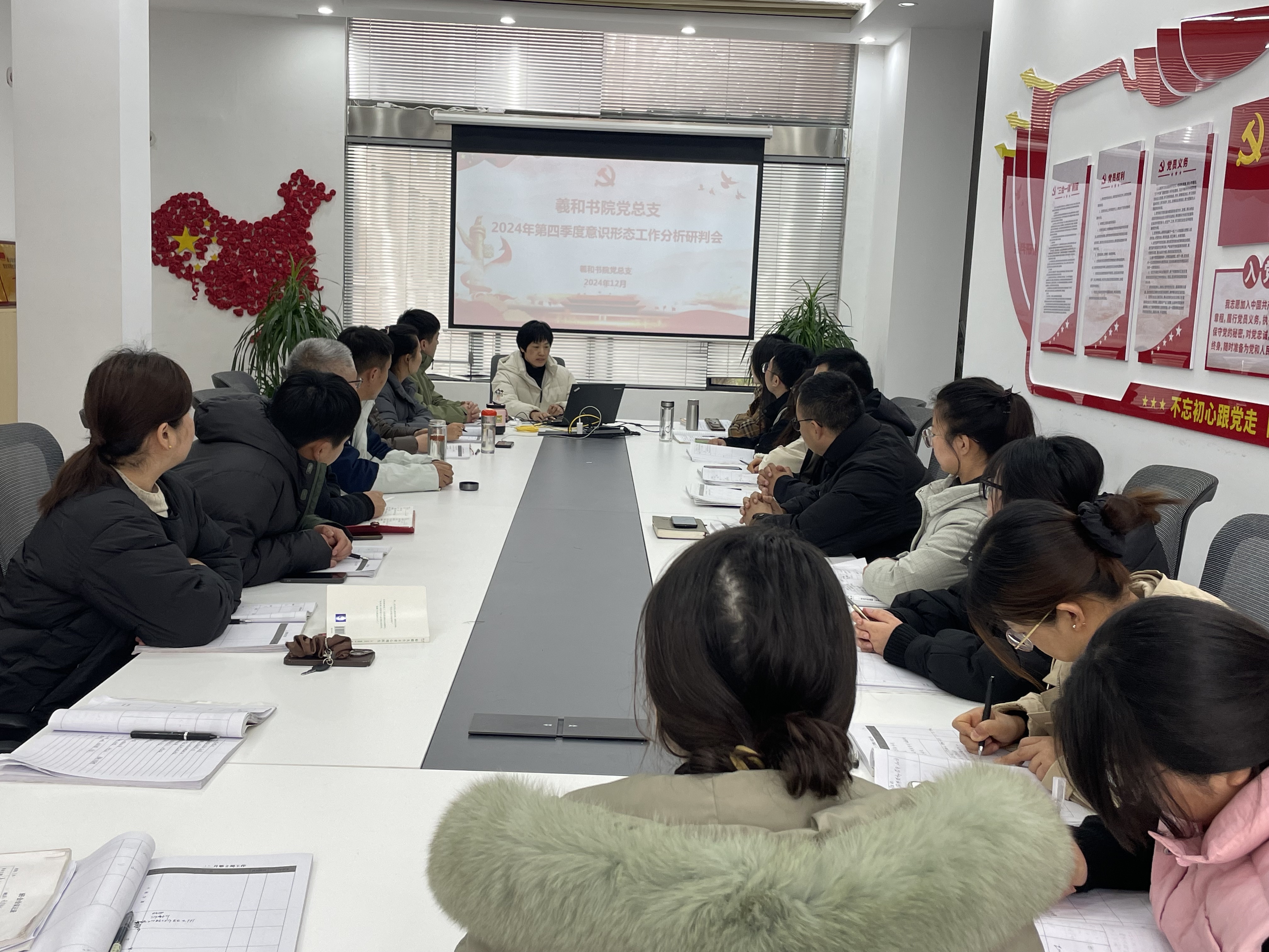 12月9日,義和书院党总支在党建驿站召开2024年第四季度意识形态工作分析研判会,围绕书院的重点工作任务,分析研判当前意识形态领域的风险点及存在问题。会议由義和书院党总支副书记刘小磊主持,书院全体教职工参加。