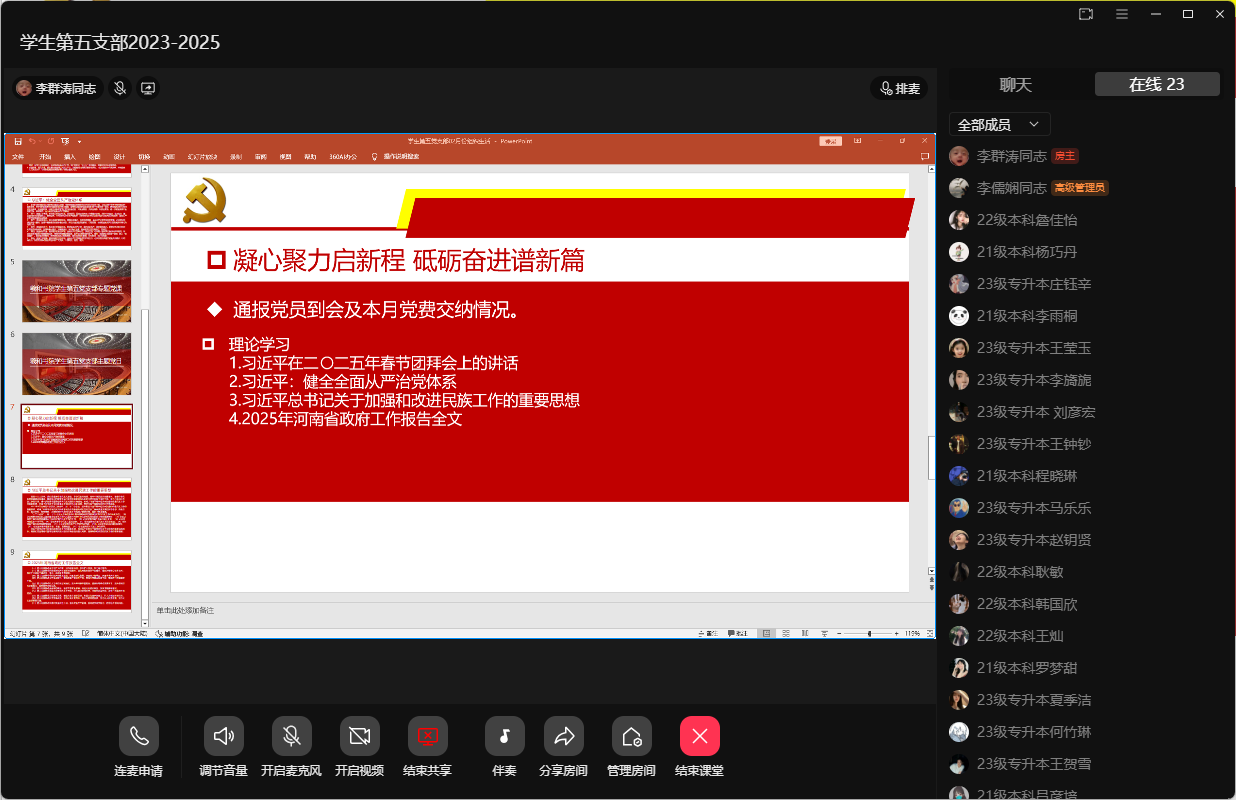 2025年2月24日上午,羲和书院学生第五党支部在支部群课堂开展2月份主题党日暨政治理论学习活动。活动由支部书记李群涛同志主持。