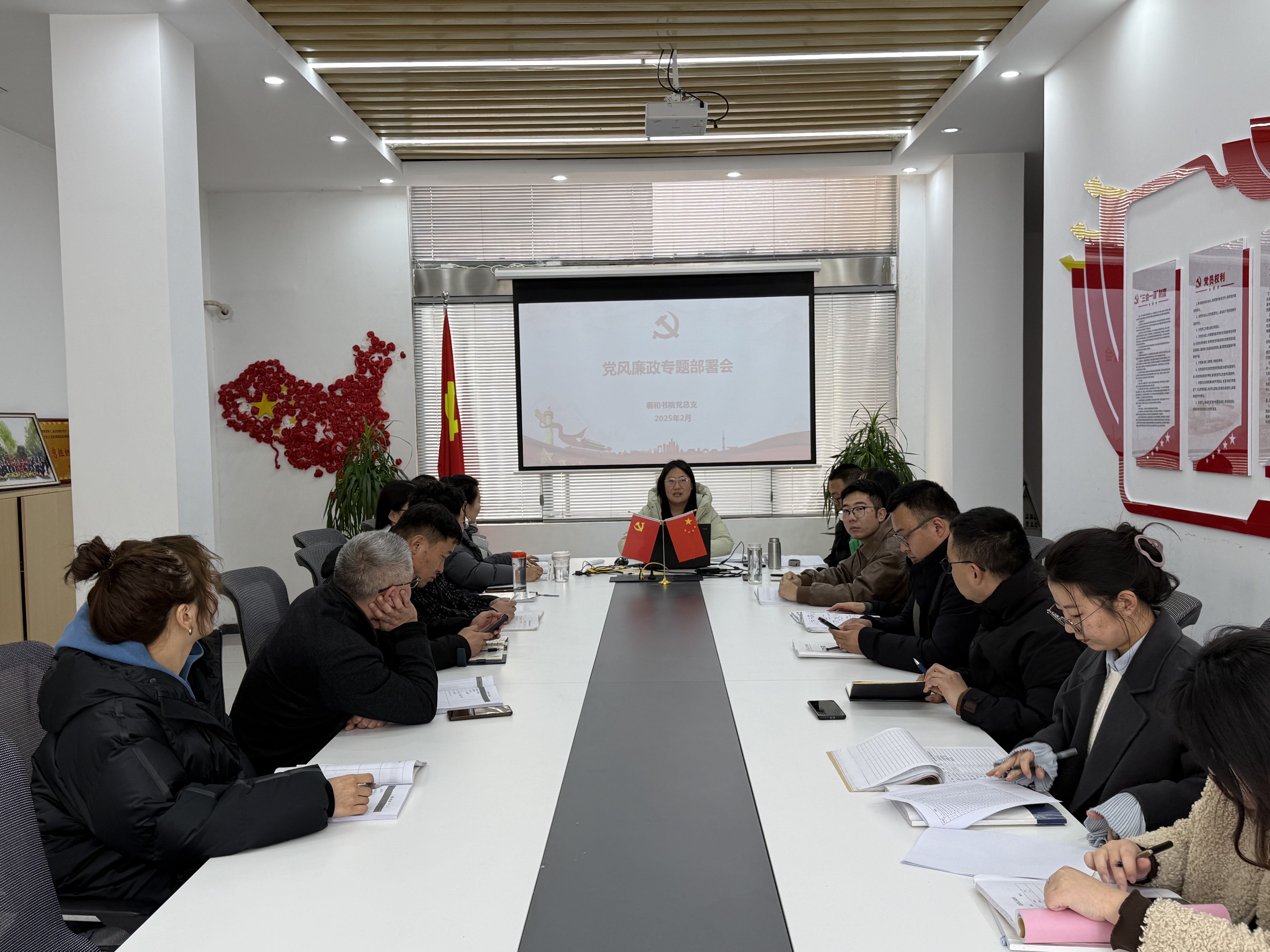 2月26日,在党建驿站召开2025年党风廉政专题部署会议,会议由党总支副书记刘小磊主持,书院全体教职工参加。会议回顾了2024年全年党风廉政建设主要工作,并对2025年上半年党风廉政建设工作作出部署。刘小磊强调要坚持严的标准深入落实中央八项规定精神并提出四点要求:一是要坚持底线思维,强化意识形态工作责任制,加强风险防范,从严管理监督;二是要一体推进不敢腐、不能腐、不想腐,推进作风建设常态化长效化;三是发扬钉钉子精神加强作风建设,立足本职工作,紧盯关键节点,把严的基调一贯到底;四是引导党员把纪律内化于心、外化于行,形成遵规守纪、崇廉拒腐的思想自觉和行动自觉,不断营造风清气正的良好氛围。