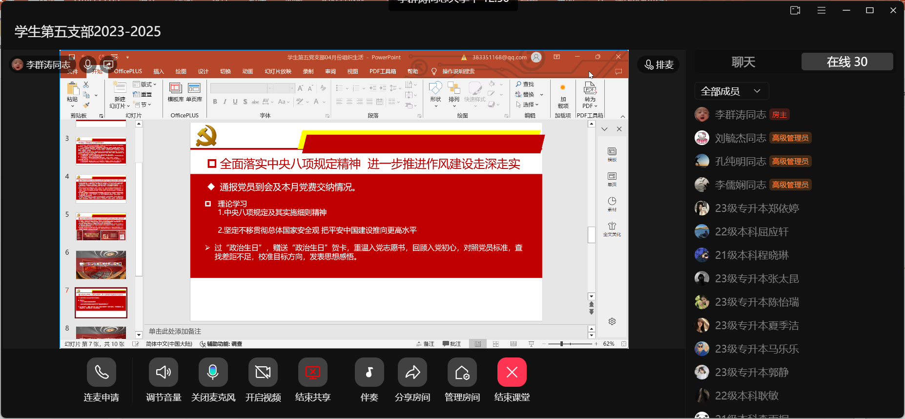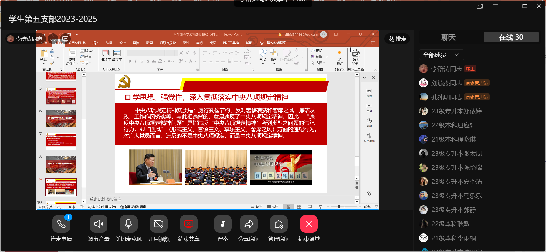 为贯彻落实《中国共产党支部工作条例(试行)》、《中国共产党党委(党组)理论学习中心组学习规则》等有关文件工作要求,进一步提高党的组织生活质量,根据校党委组织部、党委宣传部《关于开展4月份主题党日暨政治理论学习活动安排的通知》要求,4月18日晚,羲和书院学生第五党支部在支部群课堂开展4月份主题党日暨政治理论学习活动。活动由支部书记李群涛主持。本次活动主题为“全面落实中央八项规定精神进一步推进作风建设走深走实”。
