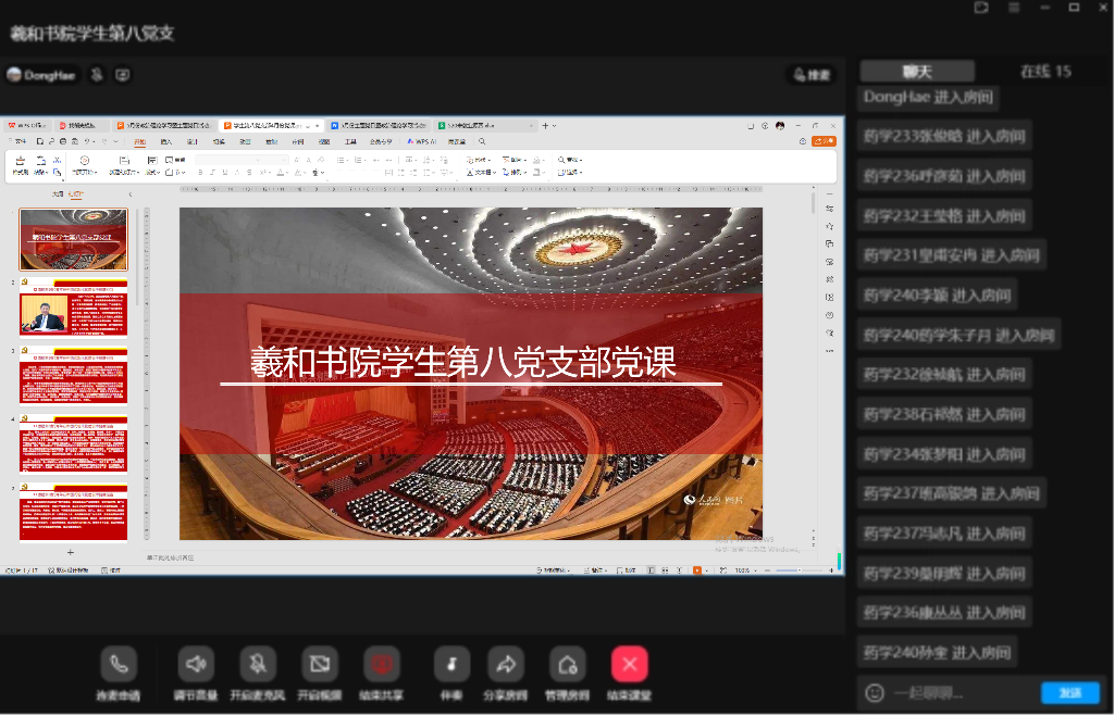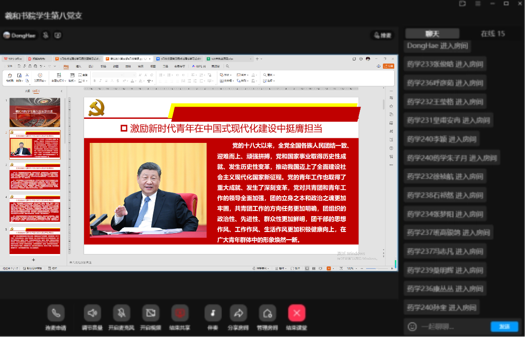 5月11日,羲和书院学生第八党支部通过线上课堂成功举办“激励新时代青年在中国式现代化建设中挺膺担当”主题党课。本次党课由党支部书记侯天伦主讲,全体支部党员参加学习。