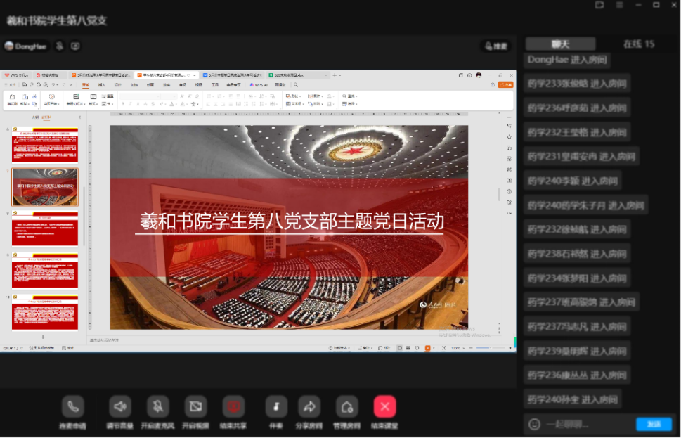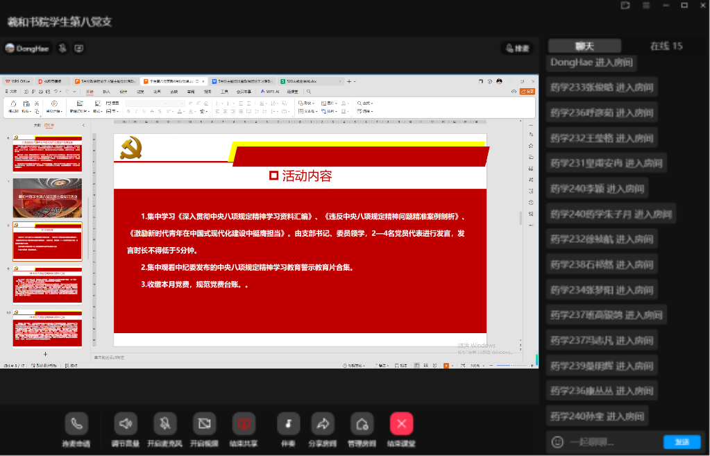 5 月 11 日,羲和书院学生第八党支部在党支部书记侯天伦的主持下,以线上会议的形式,开展“赓续五四精神守初心 贯彻中央八项规定精神担使命”主题党日暨政治理论学习活动。支部全体党员、入党积极分子以及师生代表积极参与,深入学习相关精神,进一步增强党性修养和责任意识。