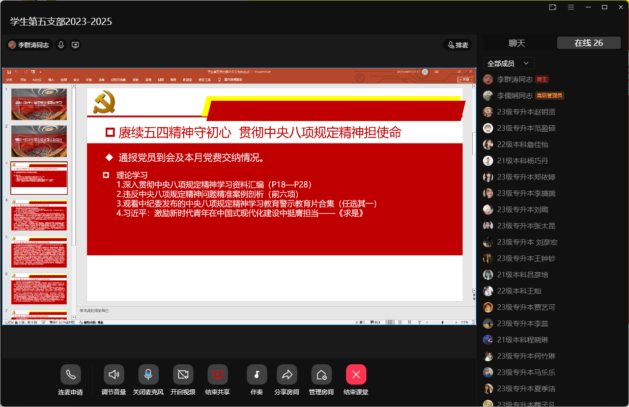 5月16日,羲和书院学生第五党支部开展5月份主题党日暨政治理论学习活动。活动在支部群课堂进行,活动由支部书记李群涛主持,活动主题为“赓续五四精神守初心 贯彻中央八项规定精神担使命”,全体支部党员参加。